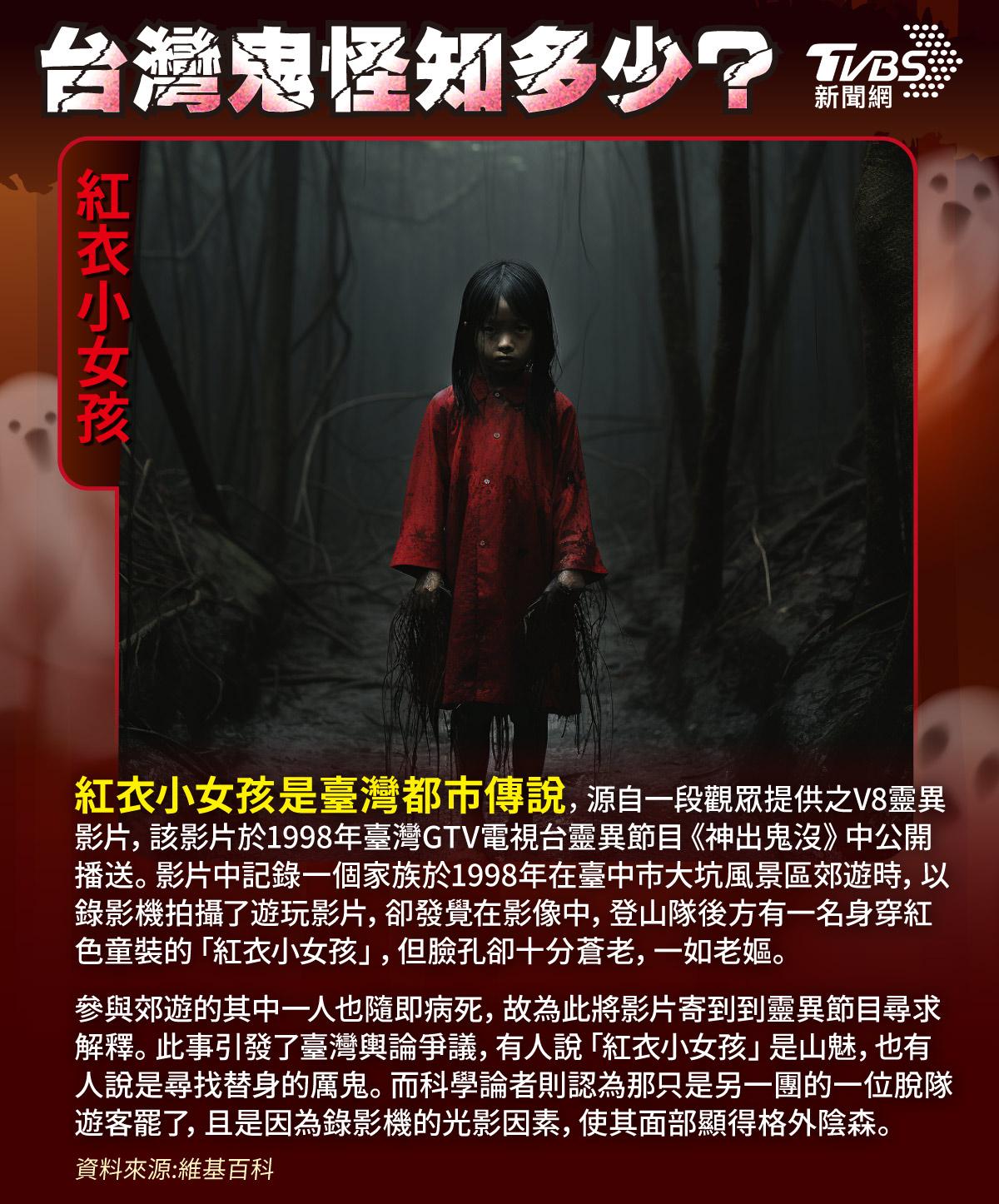 紅衣小女孩源自一段民眾拍攝的V8靈異影片。影片中記錄著一家人一起登山的畫面,沒想到卻拍到隊伍後方有一名身穿紅色童裝的小女孩,仔細一看,面孔卻如老太太一般蒼老。離奇的是,這次旅遊之後,家族其中一人竟然就病死了。