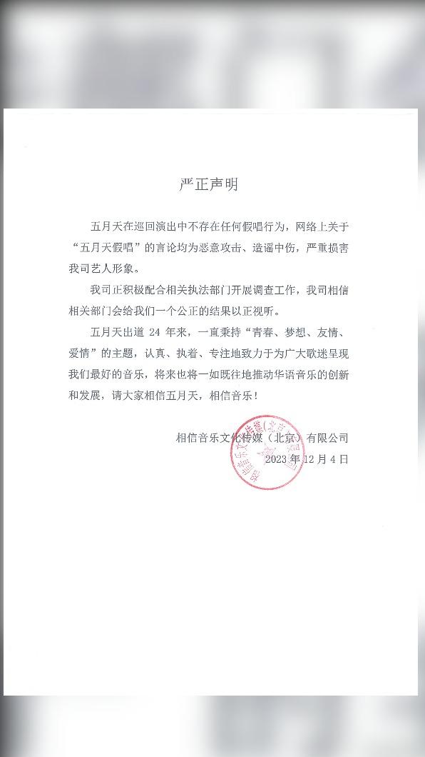 五月天日前卻被一名大陸博主「麥田農夫」指控上海演唱會疑似假唱,稱經專業軟體鑑定五月天上海演唱會的12首歌,疑有5首歌假唱,這件事在網路上引發效應,連大陸官方都開始要介入,對此,五月天所屬的相信音樂,發出嚴正聲明,強調惡意中傷,正積極參與相關執法單位進行調查工作,有關部門會給五月天一個公正的結果以正視聽。