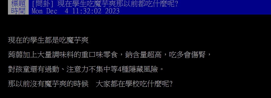 一名網友在「PTT」發文直言,現在的學生都是吃魔芋爽,蒟蒻加上大量調味料的重口味零食,鈉含量超高,吃多會傷腎,對孩童還有過動、注意力不集中等4種隱藏風險。因此他也好奇,「那以前沒有魔芋爽的時候,大家都在學校吃什麼呢」?