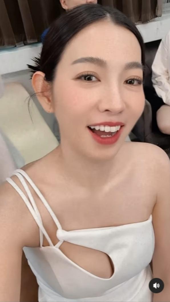 米可白曬出自拍影片表示:「早安~新髮型。」畫面是從米可白的臉部特寫,對著鏡頭甜笑,接著畫面逐漸拉遠帶到她的上半身,只見她穿著單肩綁帶設計的禮服,胸口有個挖空設計,邪惡視角若隱若現,幾乎要曝光。