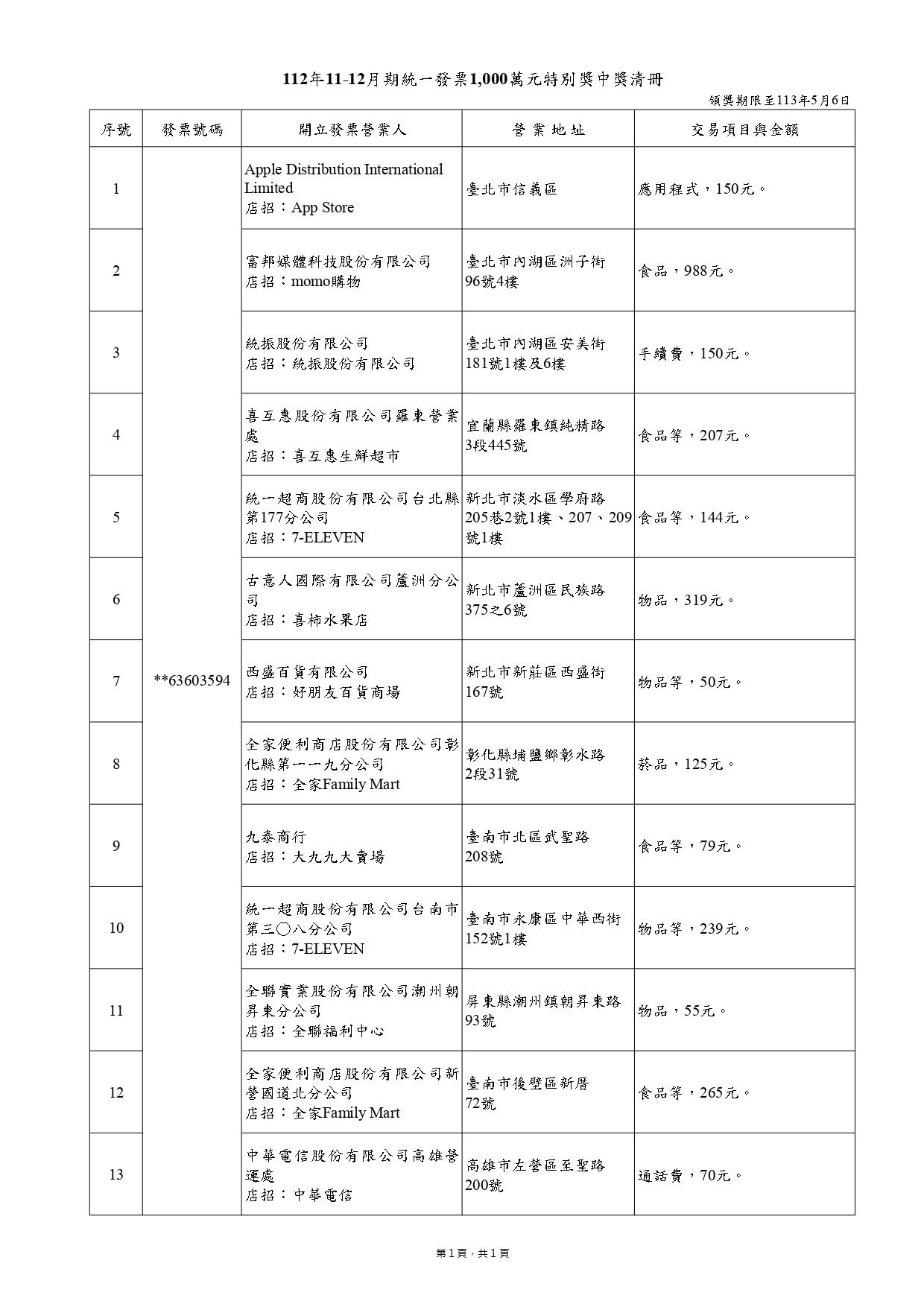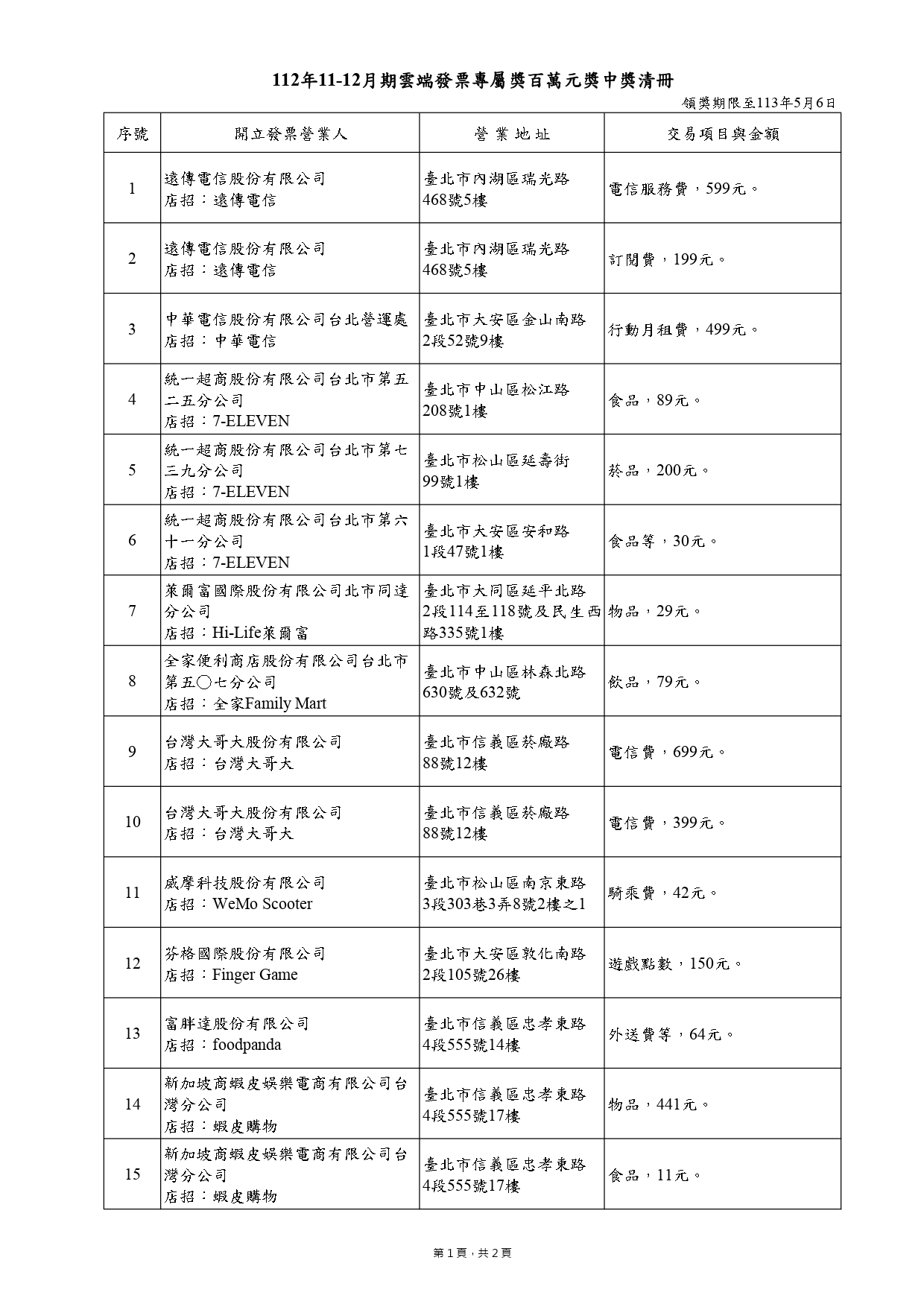 而雲端發票專屬的百萬得獎清冊,其中特別的是,在南投的一名得獎者只花50元的通話費就中百萬,財政部推測可能是家用電話的基本話費;另外也有一筆消費是「騎乘費」42元,是消費者騎乘共享機車後開出的發票,也幸運中百萬。