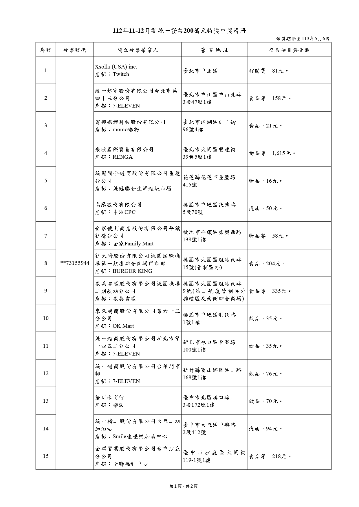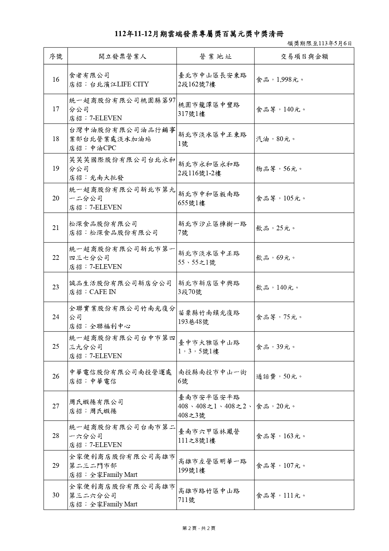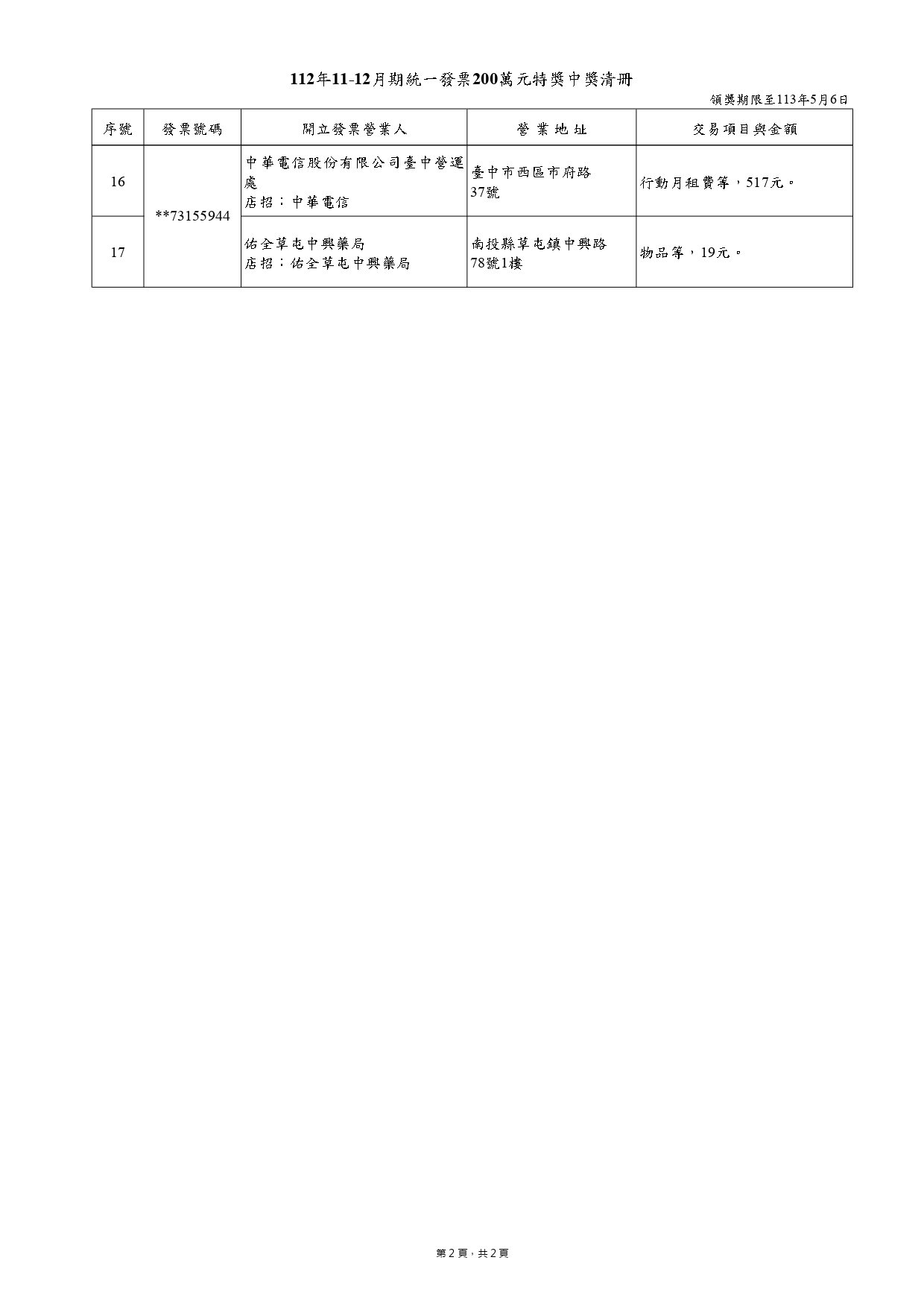 另外200萬元發票得獎清冊,總共有17名中獎者,其中一名幸運兒在花蓮的統冠生鮮超市僅花16元就中獎;另名中獎者僅花19元,在南投草屯的藥局開出,不過財政部說,這名中獎者因為有扣除紅利點數,實際花費是超過19元。