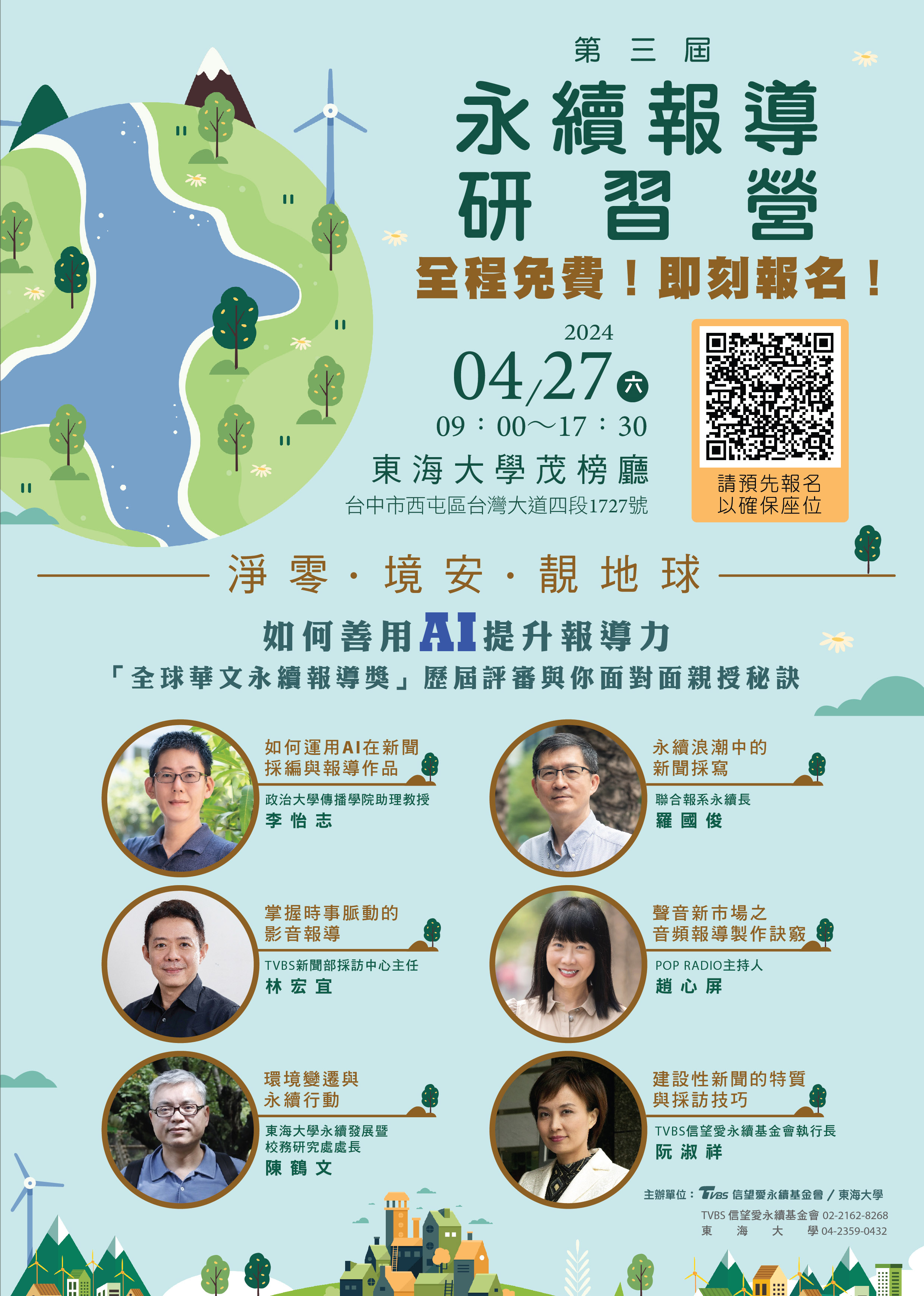 TVBS信望愛永續基金會與東海大學,連續三年共同舉辦學習課程「永續報導研習營」。這個研習營旨在讓參與者學習到如何說故事、做好報導的能力,並善用AI新浪潮,運用「建設性新聞學」的方法,闡述永續發展議題。通過這個研習營,參與者將學會如何透過報導的力量,讓閱聽大眾深刻反思當前面臨的挑戰,並共同參與解決問題。