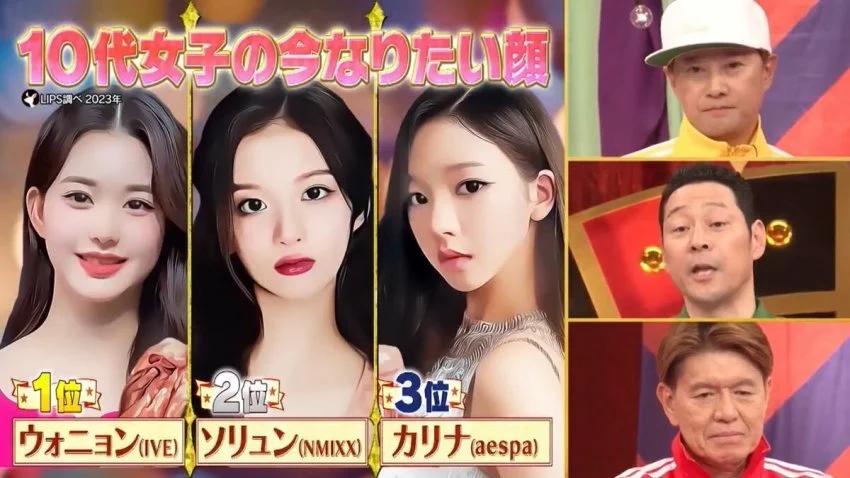 日本民調行銷單位「AppBrew」日前找來1856多位受訪者,其中囊括10多歲到50多歲的男女,詢問他們現在最想變成哪位明星的臉,也就是調查在受訪中心中目前的顏值冠軍藝人。在10多歲的受訪者心中,「最想變成這張臉」的冠軍是IVE張員瑛,其次是5月18日、19日即將來台開唱的NMIXX成員Sullyoon(薛侖娥),第3名則是aespa的Karina。
