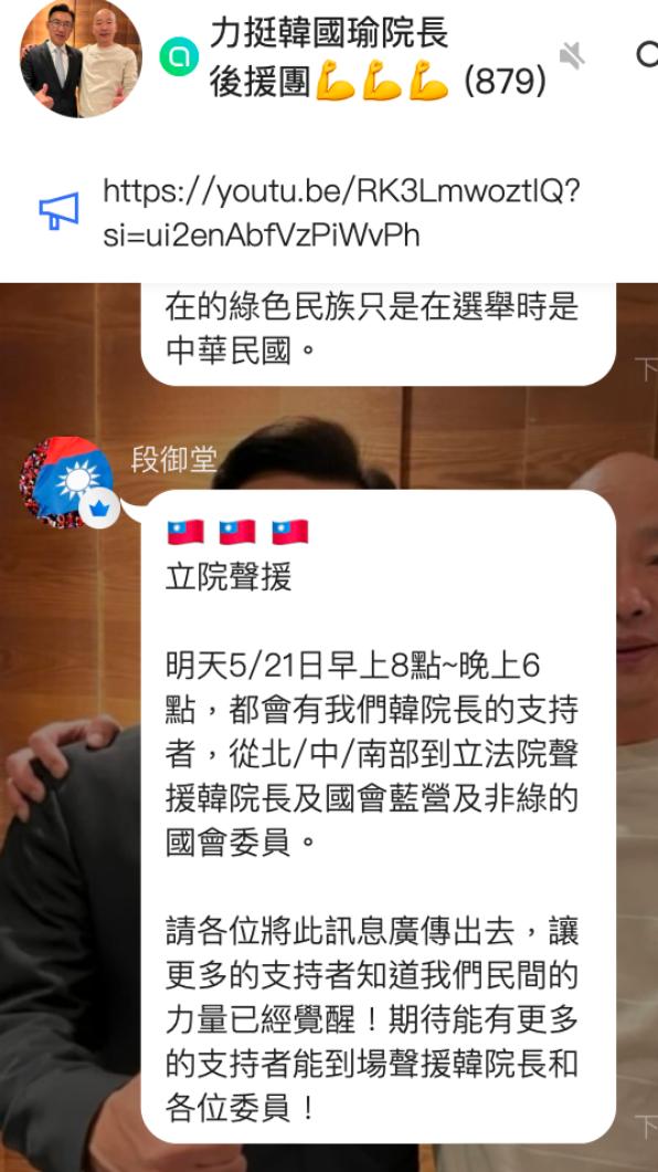 除了綠營支持者外,韓粉們也在各大網路社群上號召北、中、南鄉親,明天上午8點到晚上6點,到立法院聲援韓國瑜,以及國民黨、民眾黨立院黨團,「讓更多的支持者知道我們民間的力量已經覺醒!」