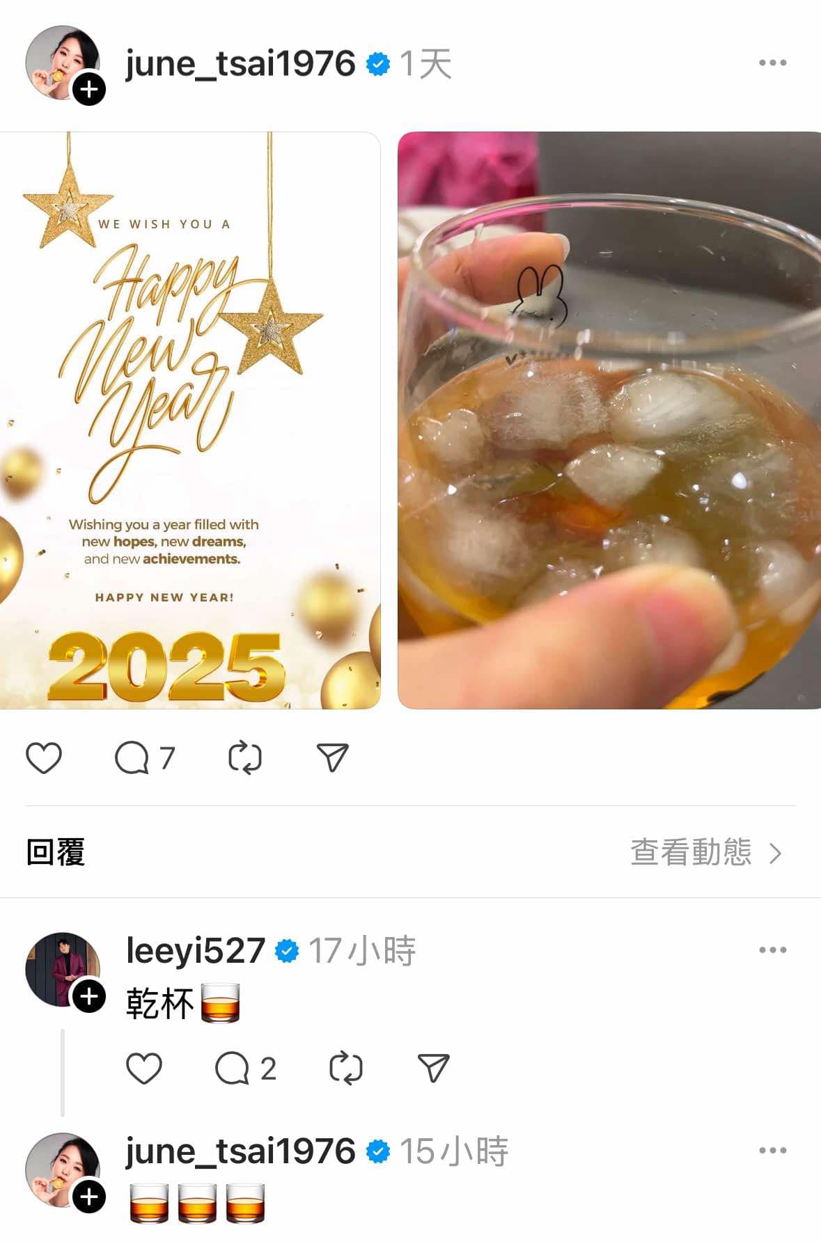 迎接新的一年,六月在Threads上發文,祝大家新年快樂,也曬出舉起酒杯的照片,老公李易馬上回覆:「乾杯。」六月則以3個酒杯貼圖回應,互動相當可愛,看的出雙方走過風波、回歸日常,有心想好好相處。