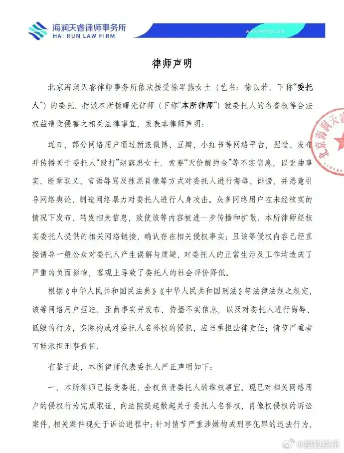趙露思前經紀人徐以若稍早發表律師聲明,表示近日很多網友在社群平台發文,捏造關於「毆打趙露思女士」以及「索要天價解約金」皆是不實謠言,並對徐以若進行人身攻擊,揚言提告:「現已對相關網路用戶的侵權行為完成取證,將視情節通過向公安機關報案、刑事訴訟等法律途徑維護委託人的合法權益。」