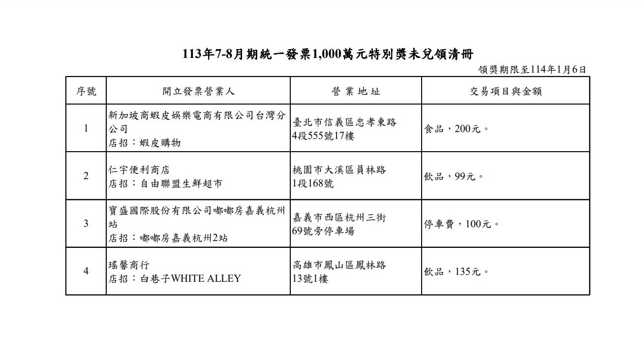 113年7-8月期統一發票1,000萬元特別獎未兌領清冊