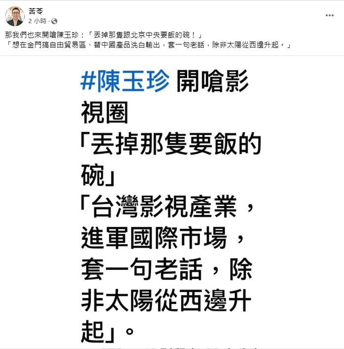 國民黨立委陳玉珍日前提案刪除文化部對公視基金會捐助經費23億的預算案,此舉也掀起影劇圈和藝文界怒火,金馬導演楊力州強力砲轟,並呼籲同業一起製作罷免的影片。而知名作家苦苓也發起開嗆陳玉珍:「那我們也來開嗆陳玉珍!丟掉那隻跟北京中央要飯的碗!想在金門搞自由貿易區、替中國產品洗白輸出,套一句老話,除非太陽從西邊升起。」