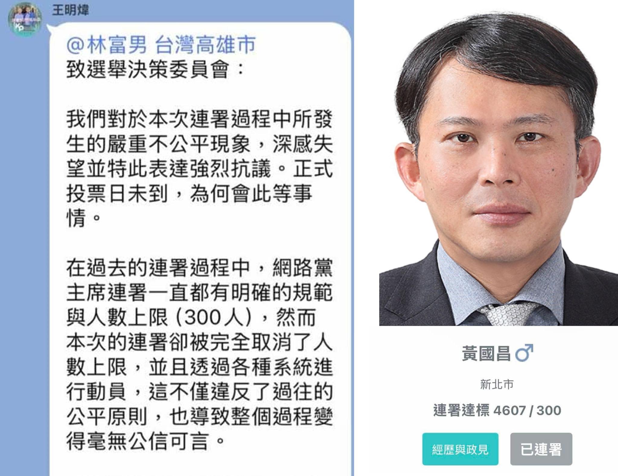 不過,網紅四叉貓在臉書貼出一則對話截圖,蔡壁如辦公室主任王明煒在群組點名黨內選舉決策委員會主委林富男,表示對於本次連署過程發生嚴重不公平現象,深感失望並特此表達強烈抗議。