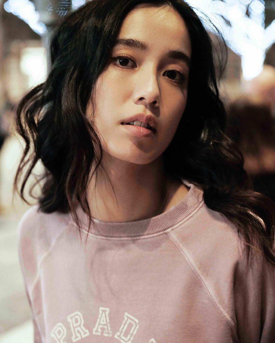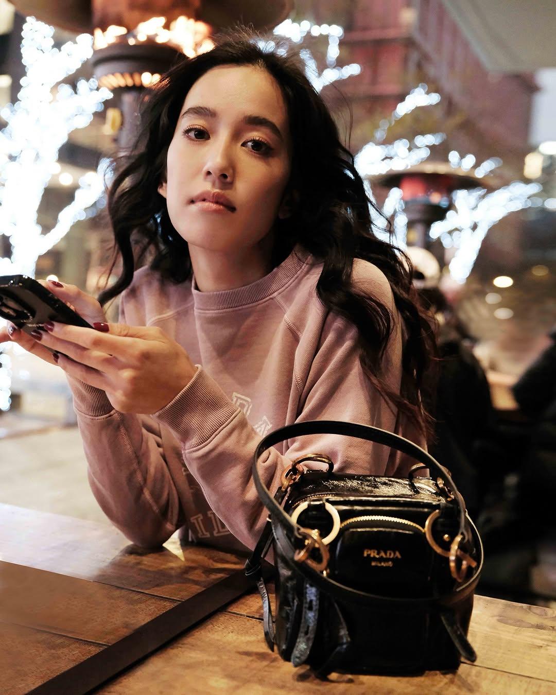 陳庭妮一頭大波浪捲髮,穿著淡紫色大學T,搭配黑色及膝裙,慵懶的靠在戶外酒吧桌上。儘管在人來人往的信義區,但陳庭妮並無戴帽子、墨鏡、口罩,完全沒遮掩,就大喇喇的在街邊酒吧。