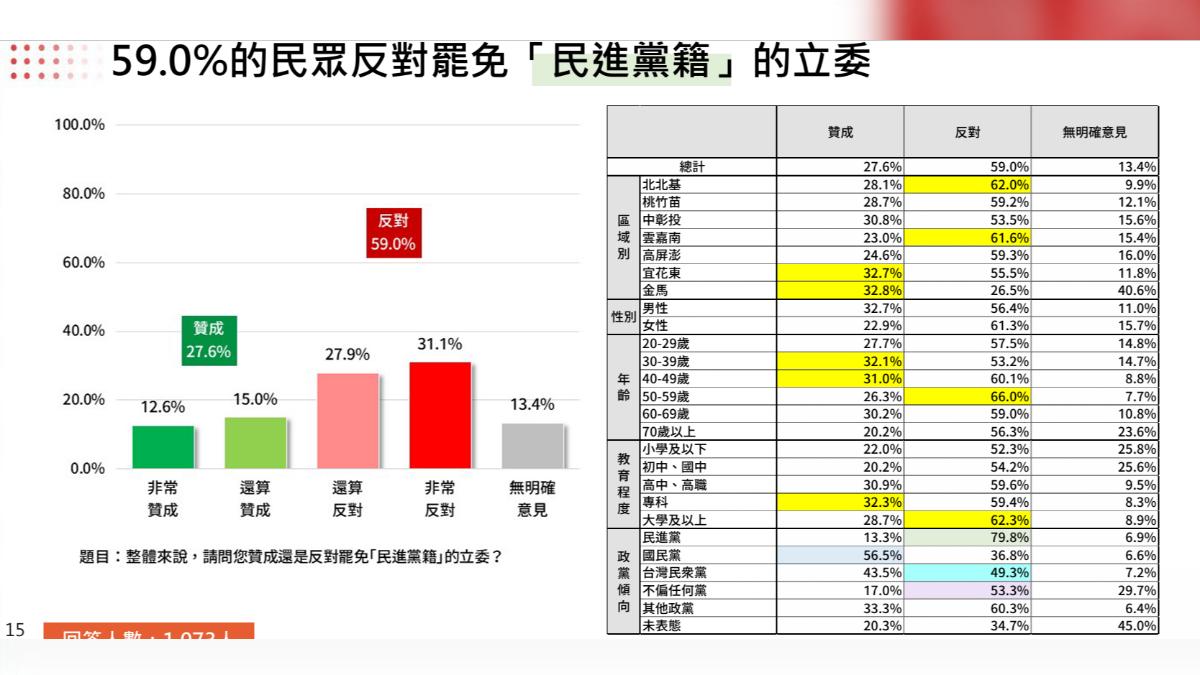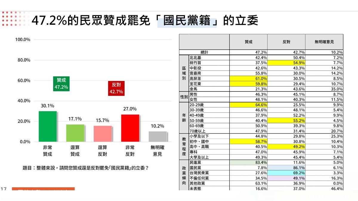 至於對於罷免立委的支持度,民調顯示,47.2%的民眾贊成罷免「國民黨籍」的立委,27.6%的民眾贊成罷免民進黨籍的立委。進一步篩選選區立委為民進黨的民眾, 60.8%反對罷免民進黨籍的立委,26.3%贊成罷免;選區立委為國民黨的民眾, 51.2%反對罷免國民黨籍的立委,39.6%贊成罷免。