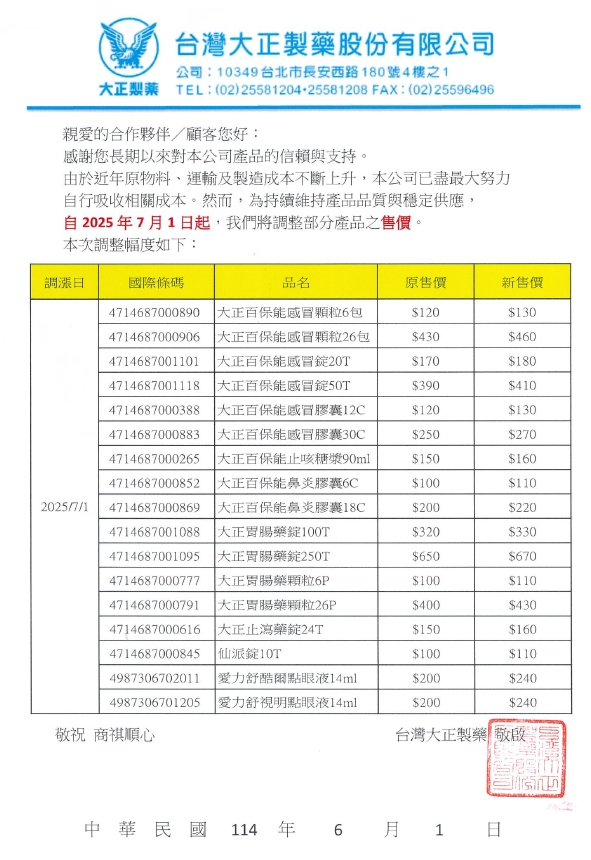 根據大正製藥公告,大正製藥將調漲17款藥品,包括大正口服感冒藥顆粒(6包、26包)、大正百保能感冒錠(20T、50T)、大正百保能感冒膠囊(12C、30C)、大正百保能止咳糖漿90ml、大正百保能鼻炎膠囊(6C、18C)、大正胃腸藥錠(100T、250T)、大正胃腸藥顆粒(6P、26P)、大正止瀉藥錠24T、仙派碇10T、愛力舒酷爾點眼液14ml、愛力舒視明點眼液14ml。部分藥品如感冒顆粒6包由120元調升至130元,感冒顆粒26包由430元漲至460元,「點眼液」調幅最大,由200元調整為240元。