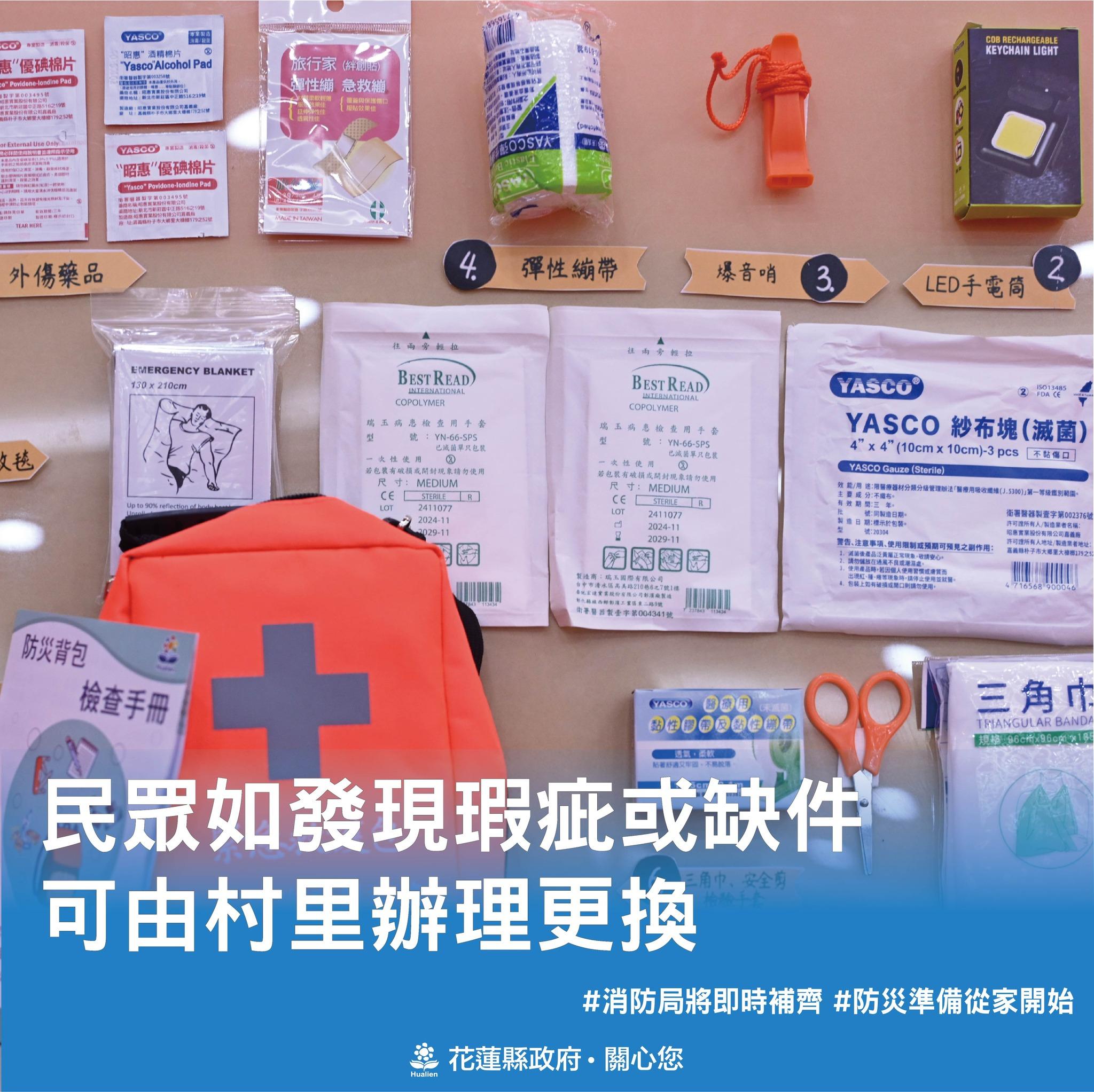 另外,如果民眾收到防災避難包與救護包內容物出現瑕疵或缺件情況,請就近向所在村里辦公處辦理換貨,由村里協助登記後辦理更換;也可撥打1999花蓮縣民服務專線洽詢,由縣府團隊協助處理。花蓮縣政府提醒,因本次LED電燈含有鋰電池,在使用及充電時,務必遵循鋰電池使用安全注意事項,例如避免過度充電、遠離高溫環境、勿自行拆解等,以確保使用安全。