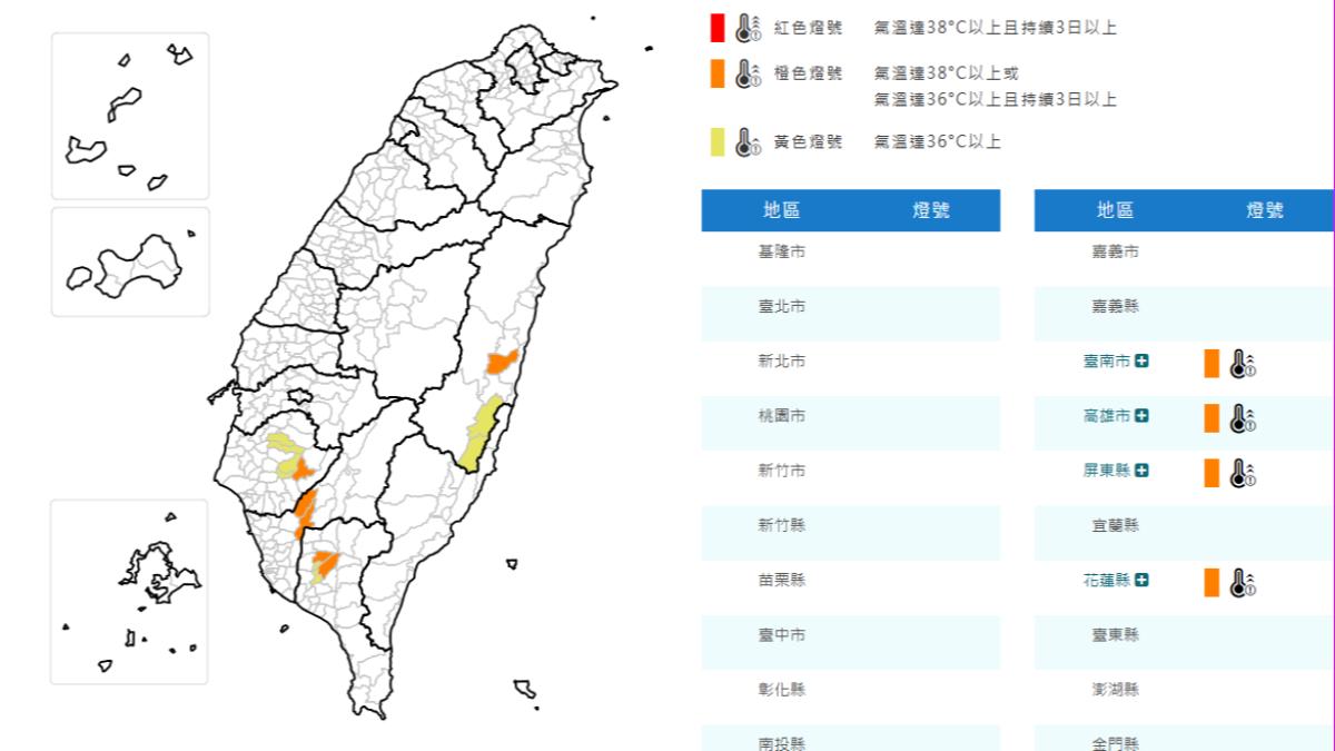 氣象今(27)早署發布台南、高雄、屏東、花蓮4縣市高溫橙色燈號,專家表示,體感溫度衝破攝氏40度,氣象署亦提醒,應避免非必要的戶外活動、勞動及運動,注意防曬、多補充水份、慎防熱傷害。