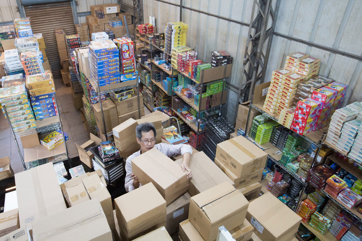 來到位於台中民俗公園旁的勃根地旅順店,一輛貨車停在門口卸貨。上百箱貨物,一批一批運進店內後方、將近40坪大的倉儲中心裡存放。勃根地老闆邱文杰正細心整理;打開箱子,裡頭全是桌遊。