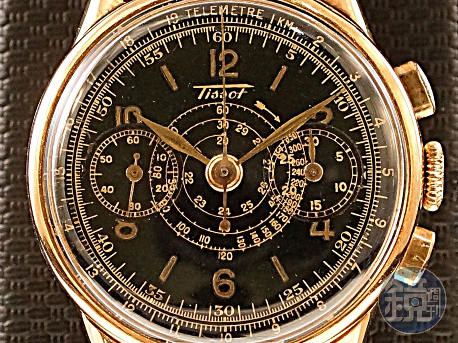 當做範例的是一只1940年代的TISSOT天梭表古董計時碼錶。它最特殊的在於同時擁有外圈的Telemetre「測距儀」與內圈的螺旋狀Tachymetre「測速儀」。9點鐘位置的60秒小秒盤為正常秒針,3點鐘位置的則是30分積分盤,中央的大秒針則是計時秒針。操作方法則是先按押2點鐘位置的計時啟動按把,然後計時秒針就會開跑秒,當過了一分鐘時30分積分盤就會前進一格並依此類推,要停止的話就再按押啟動按把一次,並按押4點鐘位置的歸零按把讓計時秒針與分針歸零。而要注意的是如果不是具有「Flyback」飛返功能的計時碼錶的話,千萬不要在未停止前就強制啟動歸零,否則會對機件造成損害。