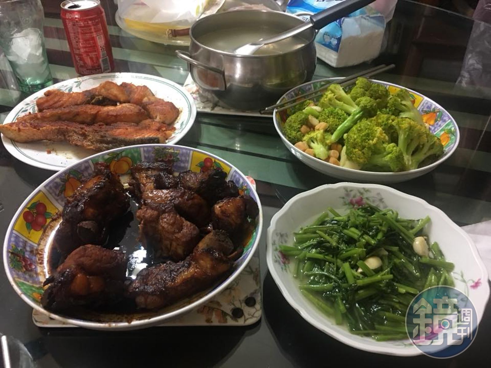 同時貼出一張四菜一湯的午餐照片,照片中有冰糖紅燒排骨、香煎鮭魚、花椰菜炒小干貝、清炒空心菜,再加上蘿蔔魚丸湯,並表示「盛夏天氣炎熱,暑氣逼人,不宜外出,就躲在家裡享受天倫之樂吧!」
