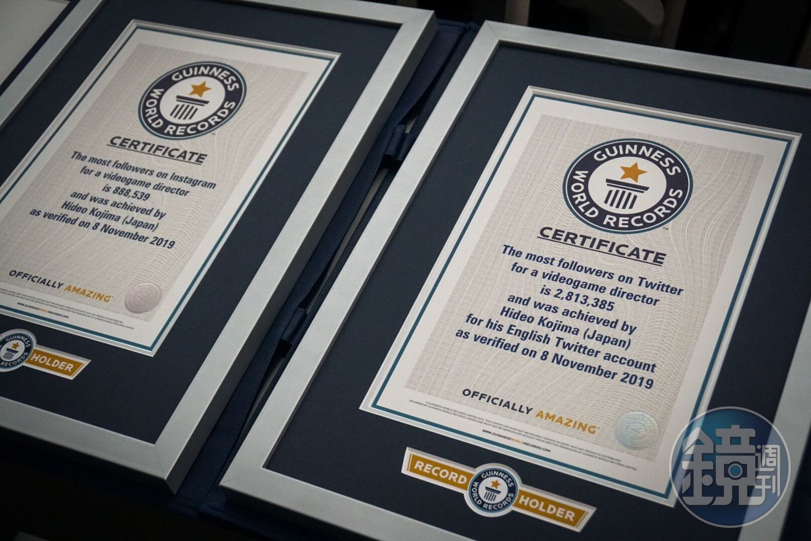 根據金氏世界紀錄資料,在2019年11月8日認證當天(也是《死亡擱淺》的發售日),小島秀夫在Twitter跟隨者高達281萬3385人,而Instagram的追蹤者也有88萬8539人,兩項數字都是現今全世界遊戲製作人之最;因此在昨日的「World Strand Tour 2019 TOKYO」活動現場,金氏世界紀錄專員也特別頒發了兩張認證證書給小島秀夫,宣布他成為這兩項紀錄的保持人。