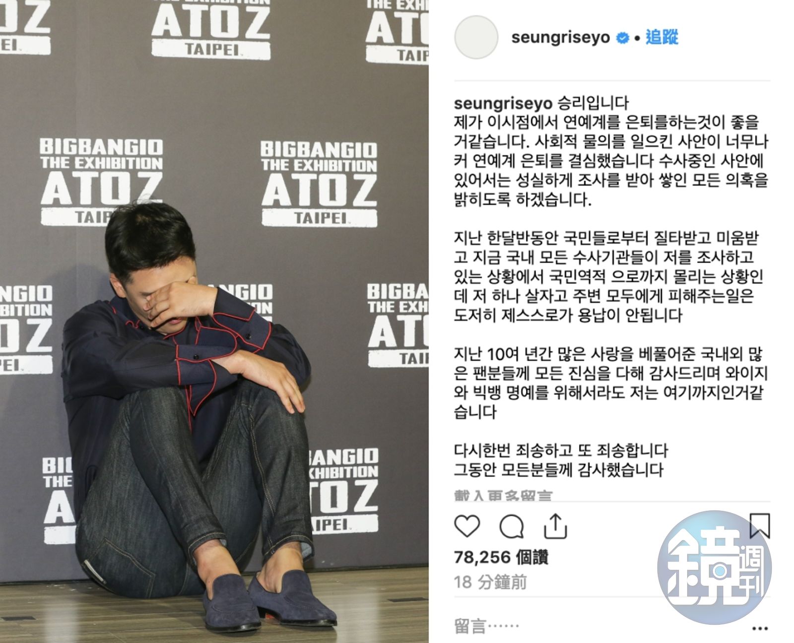 勝利在IG表示,「因為造成社會議論,事件也越來越大,在這個時間點引退是最好的吧,我決定從演藝圈退出。將會誠實地接受正在調查的事件,解開全部疑惑。過去1個半月,被國民們指責與嫌惡,將我說成了「國民逆賊」。目前正在接受調查機關調查,我無法忍受要我一個人存活而帶給周邊其他人傷害。」
