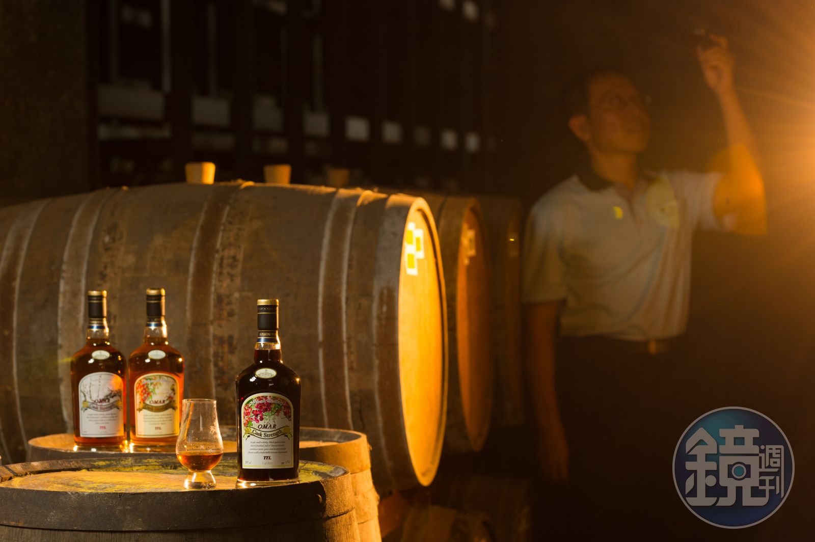潘結昌接著端到我眼前,深紫色的酒液,酒標上畫著結實纍纍的葡萄,「這是黑后風味桶威士忌,預計今年年底上市。」黑后是日治時期在台灣開始栽種,這品種在釀酒葡萄的光譜裡,就像幫襯的配角,若少了糖,高單寧與酸澀感令人皺眉。但,做為幫威士忌添加風味的過桶,反而有勁道!「黑后強硬扎口的澀感被木桶與威士忌削去了邊角,只留下如番茄李鹹的酸甜蜜餞味,紅酒風味強勢。