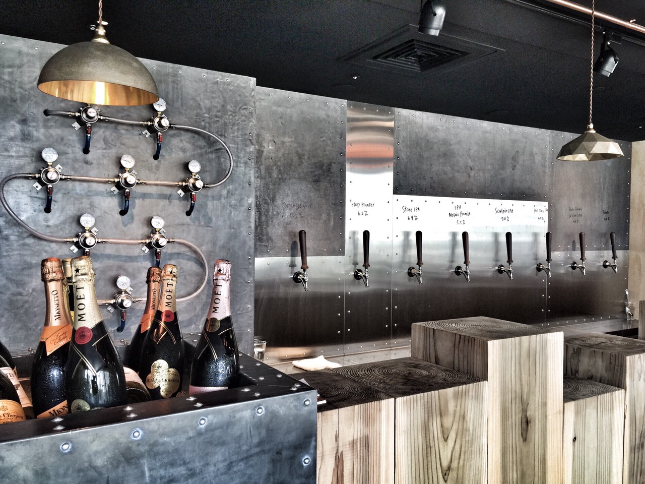 精釀酒館在路上 小心別錯過 不過也許是動線設計侷促,加上長形的店面不大,還得兼具通往5樓迴旋梯的過場功能,服務人員在忙碌之餘,還得不時爲迷途的遊客指路,「這裡是精釀啤酒。」「空中花園在隔壁哦!」我看著這些過門不入的人們,暗自惋惜,你們不知道剛剛錯過什麼啊! 有如空中樓閣,落地窗望出去是一大片綠地景致。牆上一字排開氣勢十足的16支精釀生啤龍頭,是與北部名店啜飲室的品牌「臺虎精釀」合作,品項以美國酒廠居多。這裡的餐點相當獨特,有一些如「上海醬鴨」、「滷水牛肚」、「油漬檸檬墨魚」、「泰味鮮蝦米粉沙拉」等中式、東南亞、西班牙風味的下酒小點,分量精緻,但口味麻香濃重,拳拳到肉。