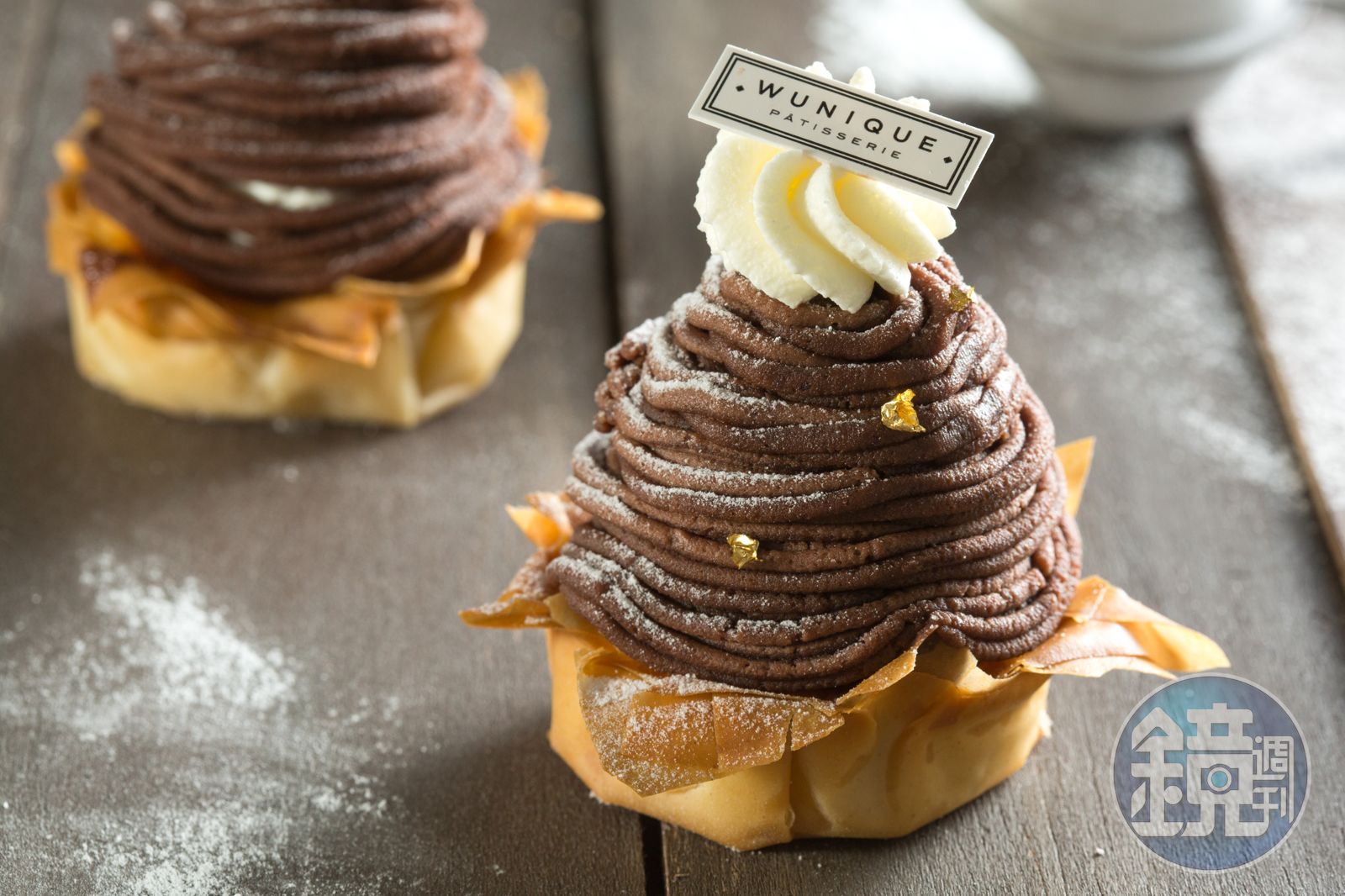 又是這麼巧。試到自己滿意而端出新作品的「WUnique Pâtisserie」主廚Tim,就用上了filo!4層極薄極脆的口感下,他的蒙布朗一點也不讓人覺得太甜,一點也不覺得太膩。它剛好也小小一個,比一般蒙布朗小一半,吃下1個馬上就能再來1個。