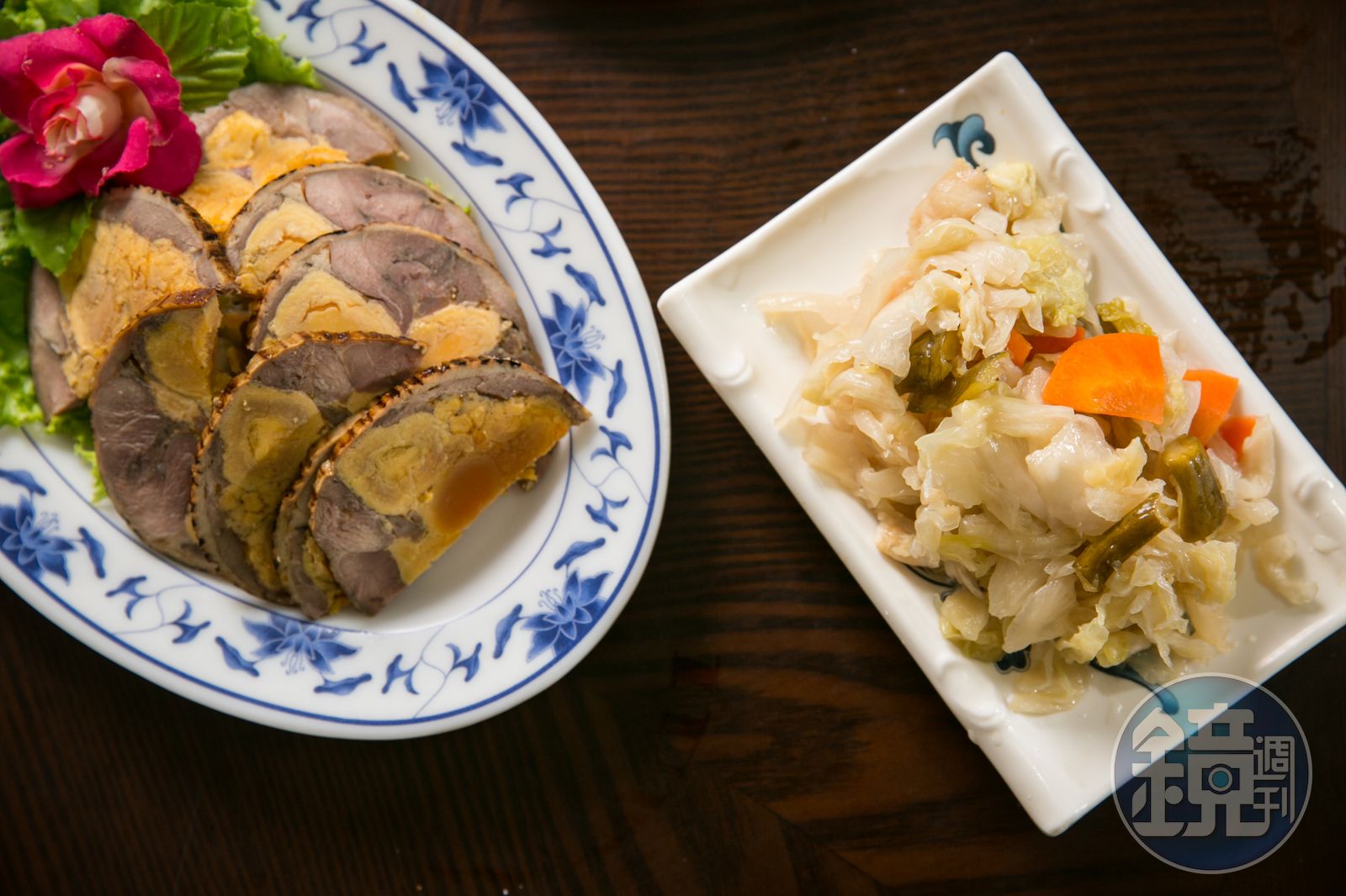 鴨身裡,再倒入多達60顆鹹鴨蛋黃,「塞不滿的話,做起來不飽滿不漂亮。」捲緊定型後,先蒸後滷再冷藏,口感鮮嫩濃郁,連搭配的泡菜,也堅持自製,「一定要用高山的高麗菜才脆甜,客人很喜歡買。」