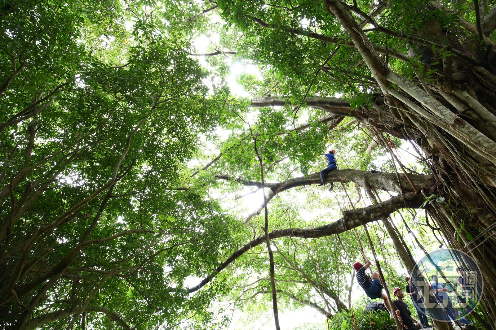小馬說,以前大冠鷲喜歡在樹上築巢,早年的布農族為了取得蛋白質,必須徒手爬上巨樹偷蛋,如今的我們,必須穿戴好裝備、利用繩索慢慢上升,才能滿足當布農族爬樹高手的感覺,同時也完成了飛上天的欲望。
