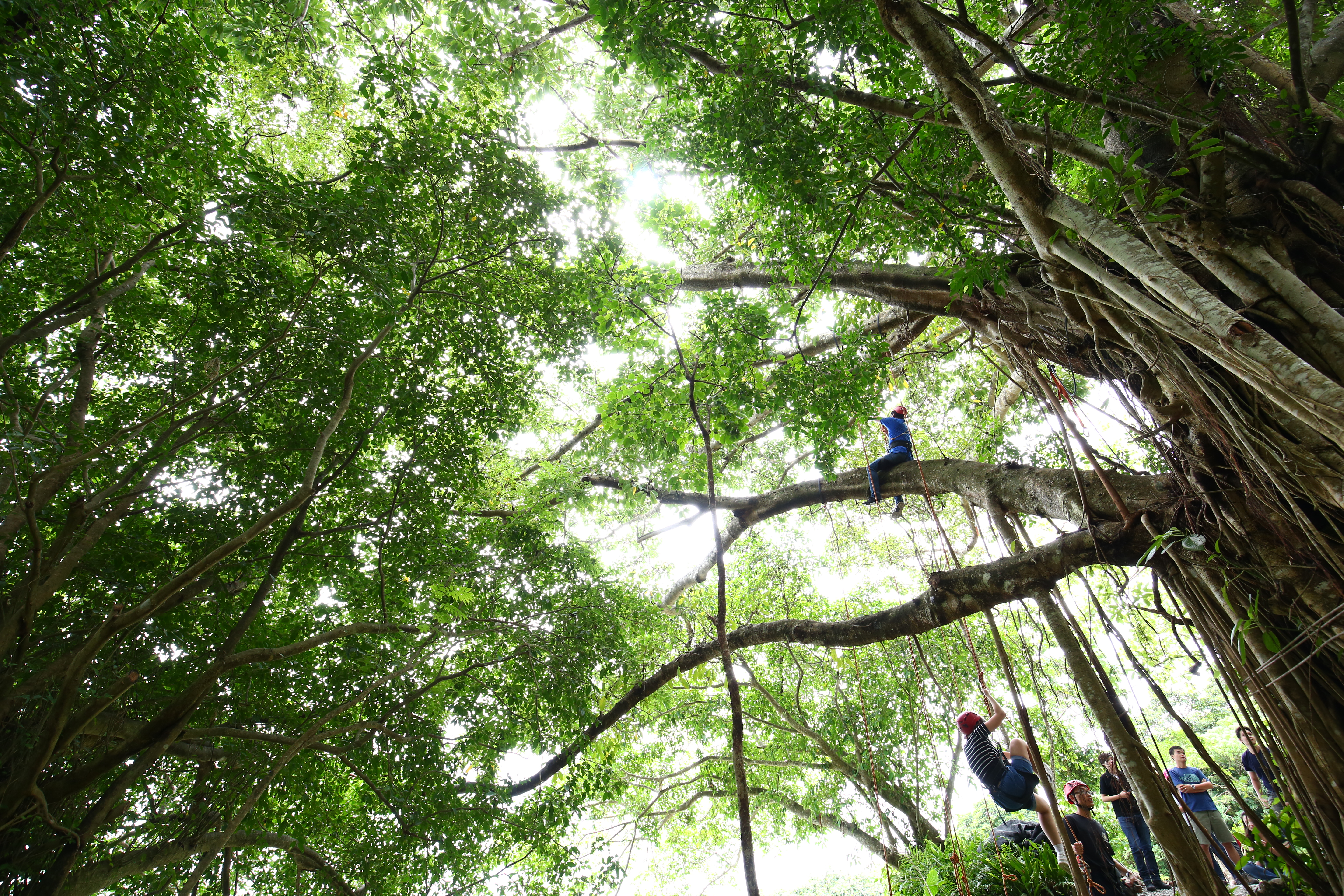 來到「磯崎好聚落」山上據點,小馬先以一首布農傳統吟唱歡迎大家,嘹亮又穩如泰山的聲音,迴盪在山谷之間,眼前如張開雙臂的巨大雀榕,是攀樹活動的最佳體驗場。