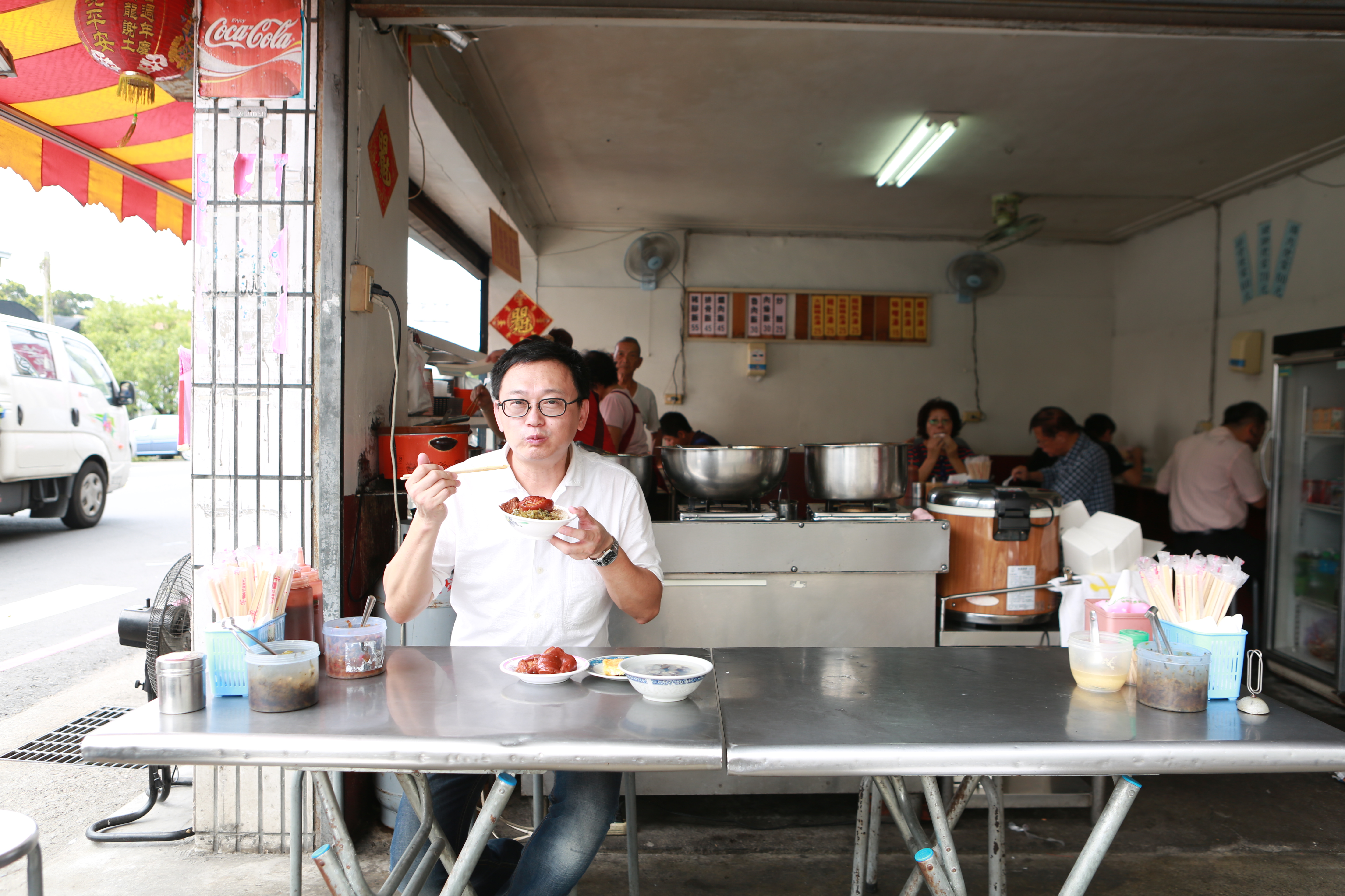 這家爌肉和彰化的路數一樣,用牙籤串成半月形下鍋滷,取用的部位是後腿連接屁股那段,肥中帶瘦,皮Q肉透。「我喜歡這種用腿庫做的爌肉,而且他好像加了紅糟下去,顏色特別紅,味道也特別甘甜。」滷好以後,依然開微火保溫,燙口豐腴,到嘴裡就化了,配上酸菜丁,不知不覺飯就扒光。