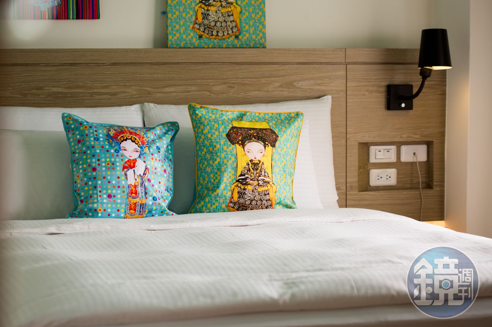 每個「家」的樣貌自然不同,最特別的是不同領域設計師創作的主題房,香港插畫家a.jin最近為旅館創作3間客房,有色彩繽紛的童趣筆調,也有帶點迷幻和黑暗的異想,不但空間裡到處有畫作,連抱枕、桌巾、茶杯、鑰匙圈都呼應創作主題,舒服躺在台南老牌德泰的床墊上,這一晚走進夢鄉,像是做夢般奇幻。