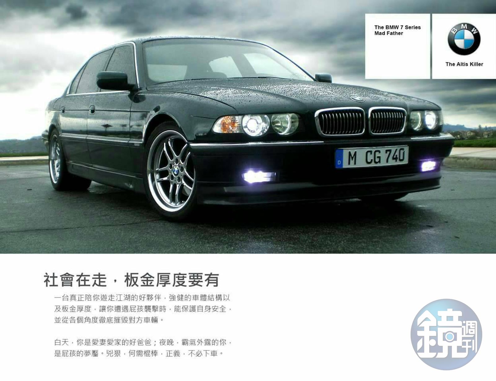也有網友藉用BMW的汽車廣告,改名為「瘋狂老爸」車型,還強調是ALTIS殺手。文宣文字寫著:「一台真正陪你遊走江湖的好夥伴,強健的車體結構以及板金厚度,讓你遭遇屁孩襲擊時,保護自身安全,並從各個角度徹底摧毀對方車輛…白天,你是愛妻愛家的好爸爸;夜晚,霸氣外露的你,是屁孩的夢靨。兇狠,何需棍棒,正義,不必下車。」