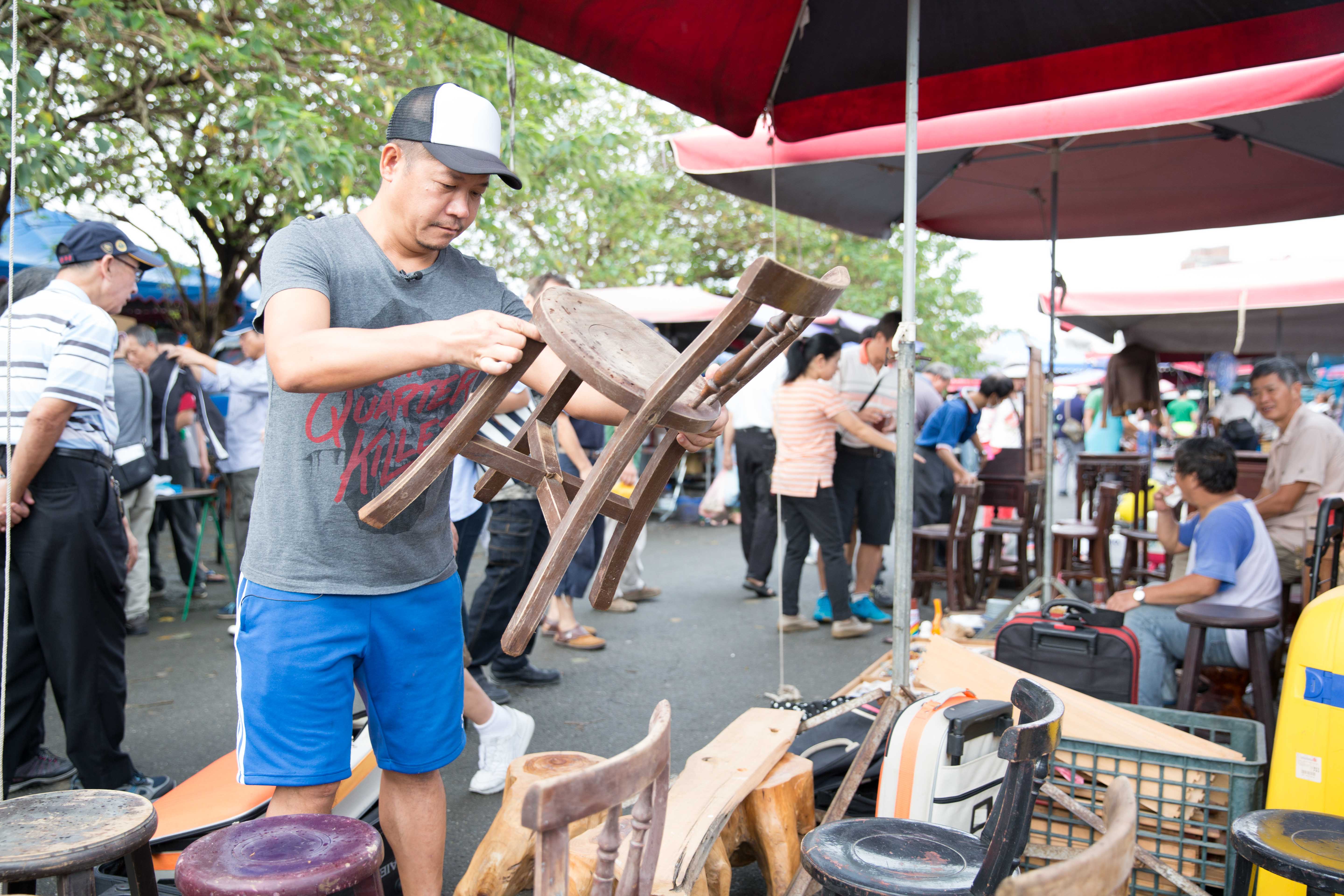 採訪前夜,整個台北還籠罩在滂沱大雨中,擔憂隔天清晨的採訪是否能如期進行,還好,一早起來窗外只是微雨,採訪照常,蕭大俠頭戴棒球帽,穿著T恤、運動短褲與夾腳拖就來了,若非認識他,肯定會以為他只是一位普通的中年大叔。 依約來到採訪地點,生平第一次知道,原來新北市福和橋下有個什麼都賣的二手市場,本來就喜歡在路邊撿拾廢木舊傢俱、逛跳蚤市場的我,像是發現新大陸般驚喜。 幾乎每週都會來的蕭大俠,深知哪攤藏有好貨。他說,不少行家天未亮前就拿著手電筒來尋寶了,想要挑好貨最好是週六一大早就來,還時不時丟來一句:「現在不買,下次可能就沒了。」 腦波很弱的我,當場買了一把椅子,本想就此打住,畢竟還有正事要辦啊,誰知大俠興致一來,「妳不是想看剪刀?」熱切火速地領著我們直搗他必逛的舊鐵件刀具攤販,還搞笑客串當老闆。