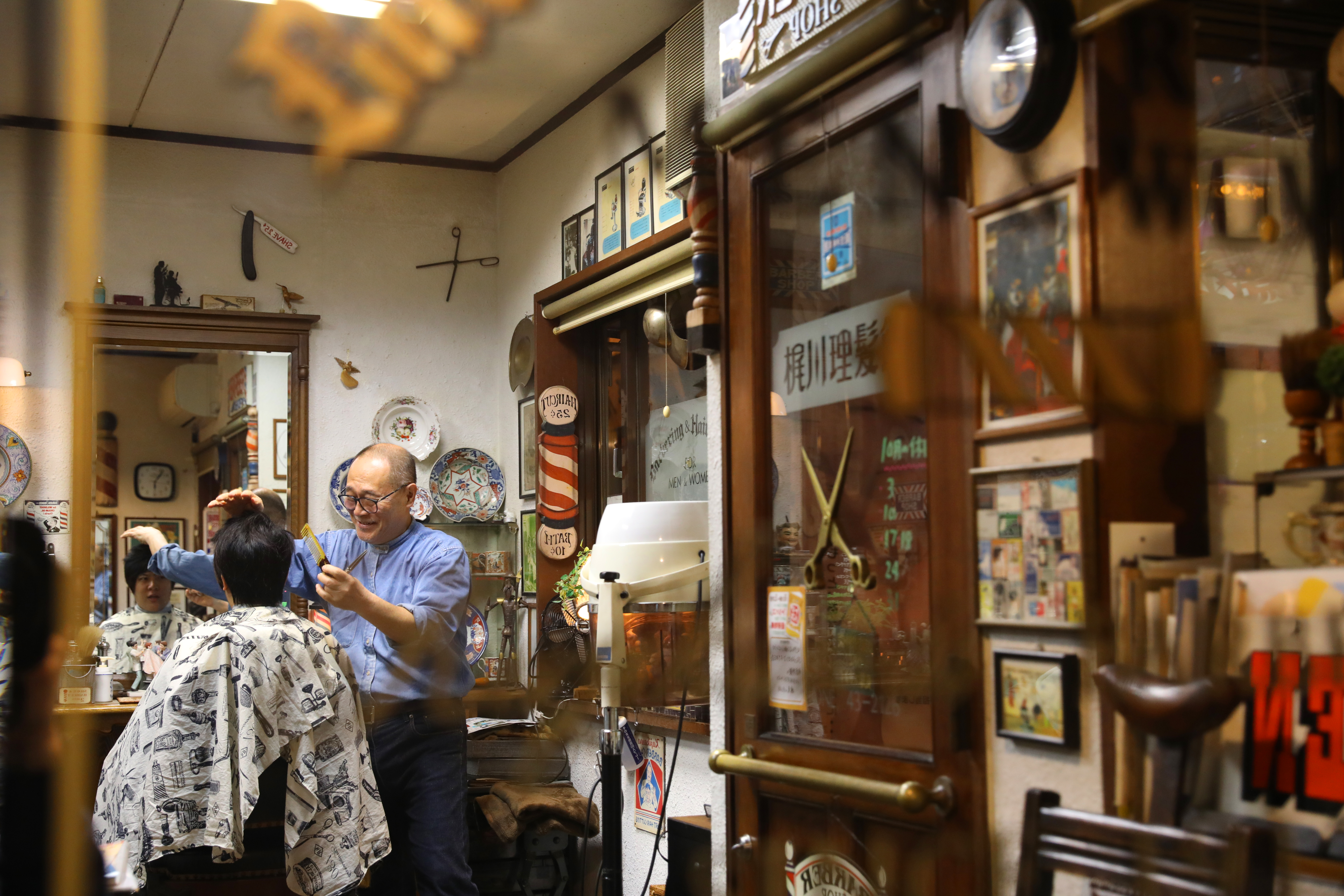 走進理髮廳,我不由自主被店裡的擺設所吸引,每一件展現奇特表情和戲劇張力:大剪刀張開利刃,理髮椅掛著馬頭,馬克杯身有牛頭、骷顱頭,還有理髮師手持刀刃、抵住客人脖子的瓷器人像。誰敢伸長脖子來剃頭?我心生疑惑。「要不要親身體驗一下剪髮跟修容?」梶川先生笑笑地問,沒想到,竟是用這樣的開頭展開我們的採訪。 我的文字記者搭檔不假思索馬上說好,只見梶川先生刀法俐落,不一會兒髮型變得有型許多,接下來一絲不苟地敷臉、修容,手法熟練又細膩,看著搭檔的舒服表情,在旁拍照的我也忍不住動念想體驗,這樣老派優雅的服務,何嘗不是一種無形的古董?