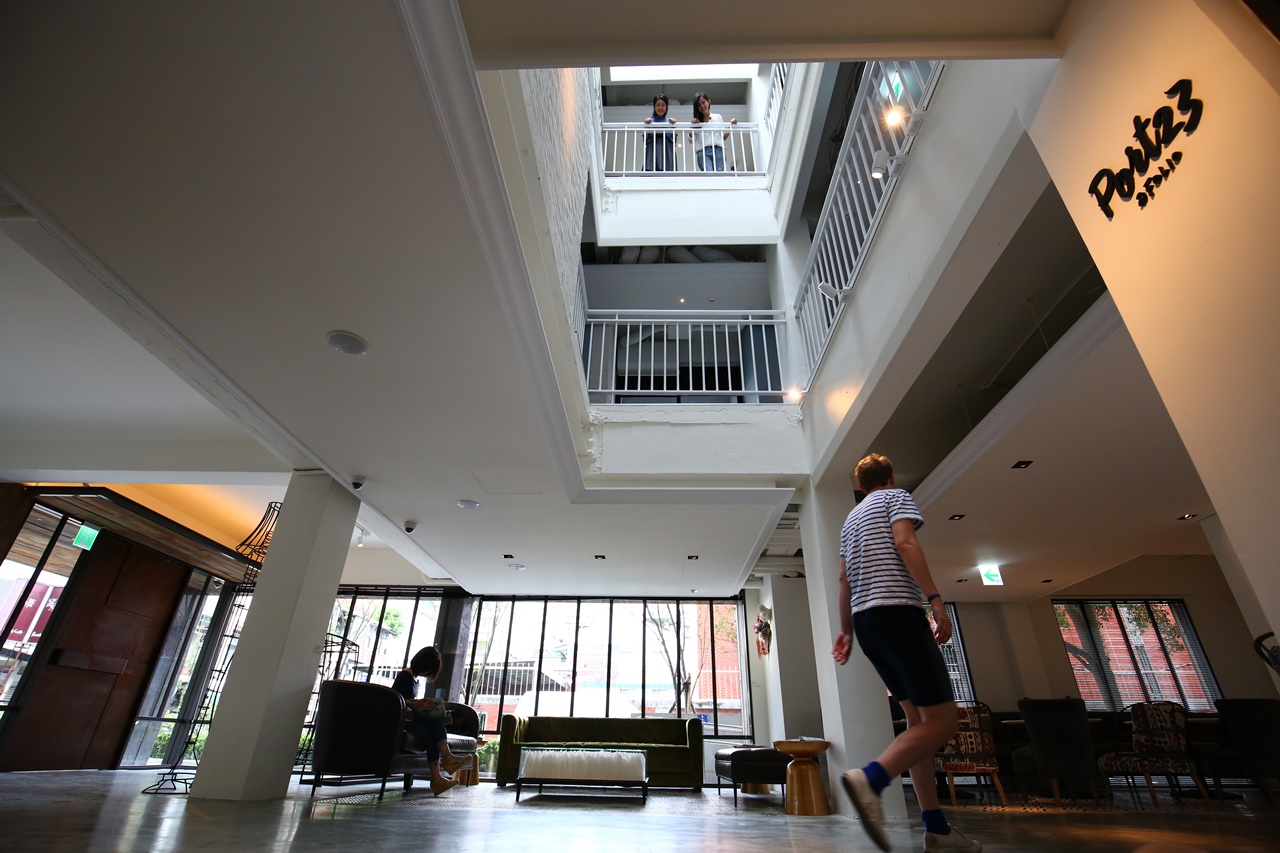 走進旅館,沒有譁眾取寵的裝潢,巧妙以新舊混搭的「接地氣」設計,帶出老台北的感性,大廳以粉光水泥地板拼接馬賽克地磚,不成套的時尚家具成了主角,每個角落像是不同人家的客廳;空間格局也沒動太多手腳,最大工法是開了3個天井,陽光穿透樓地板,空中還飄浮羽毛藝術品,像是游雲般,俯瞰或仰視內部空間,多了分普普藝術的趣味。