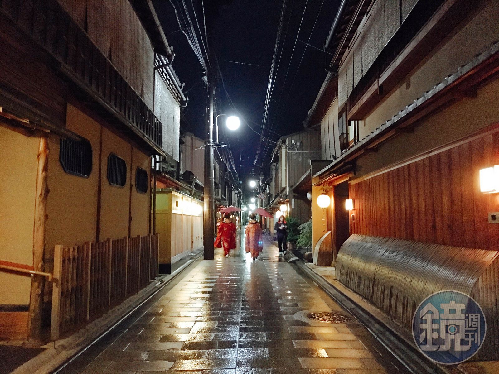 深夜11點左右的「下班」時間,我走進京都的花街。這裡被外國旅客形容為京都的「紅燈區」。雖說稱為紅燈區,但要與藝伎接觸還真不容易。目前在京都的藝伎僅剩不到200人,想在用餐或生意時有藝伎陪伴,或者觀賞其身段柔美的優雅演出,得交由茶屋接洽,但若沒有些在地門道,想預約也難。