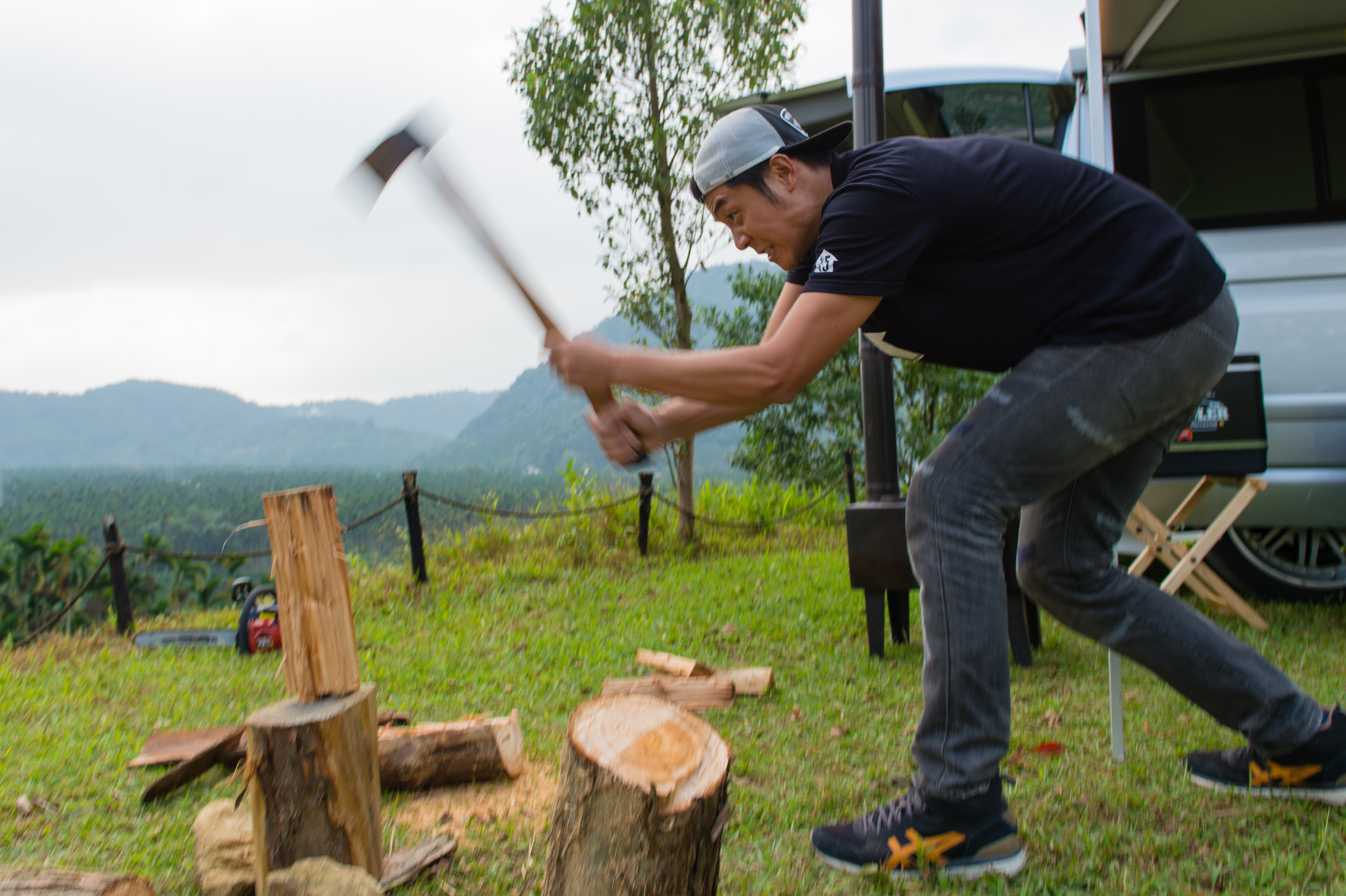 隨後,姚元浩走向營區邊,搬了一塊營區老闆事先為他準備好的香杉,我才知道這就是要給暖爐燒的木柴,姚元浩熟門熟路地拿起電鋸,我在旁邊看得心驚膽戰。