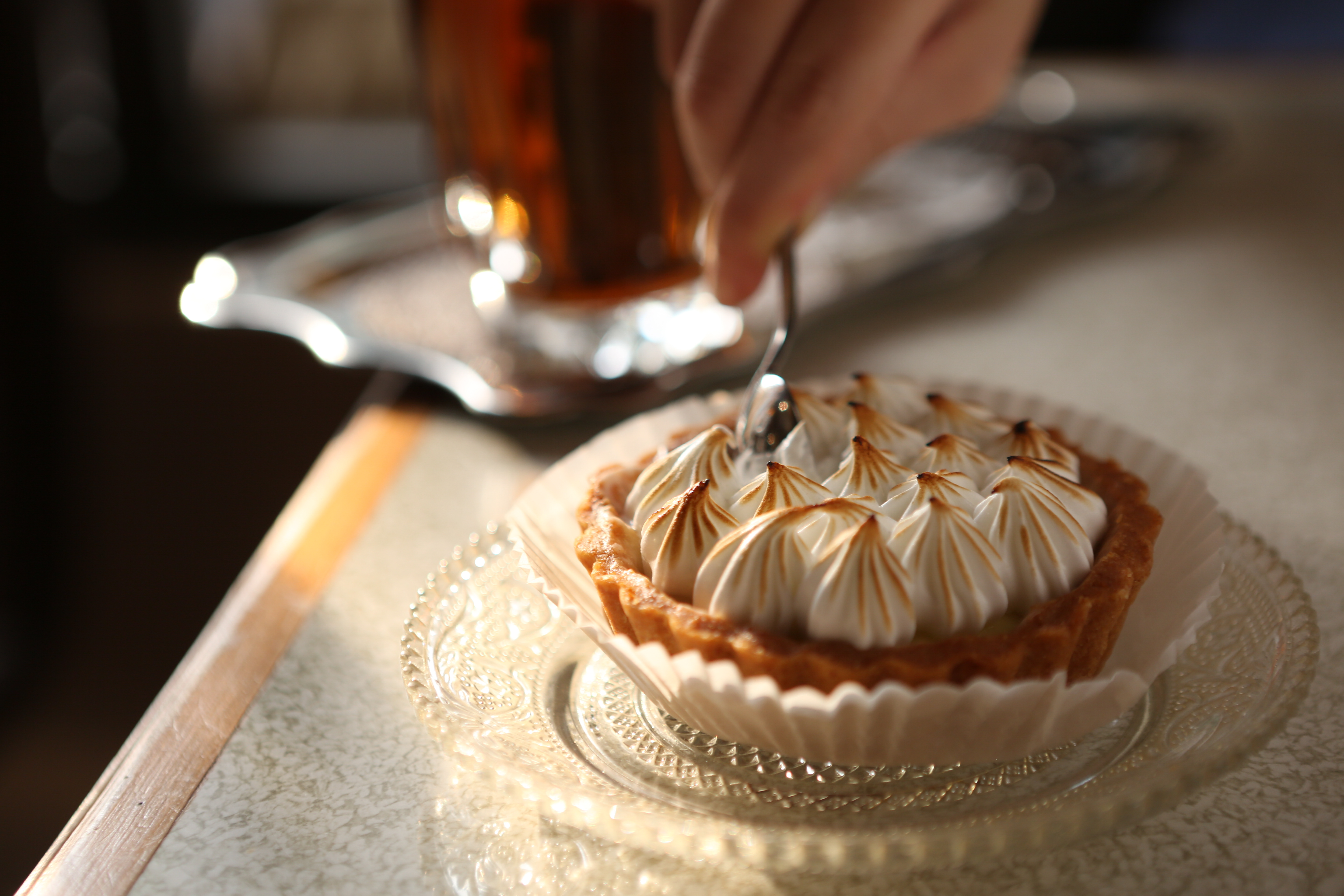 昭和風情洋菓子店 酸溜溜檸檬派尾韻生津 打造成日本昭和時期建築的KADOYA在台南才開設4年多,老闆阿鴻其實是來自「台北天龍國」的37歲台南新移民:「有一天,我朋友騎車載我來看這個本來是洗車場空地,我當天就租下來,和朋友合畫空間設計圖,找人接好水電,就賣起蛋糕,一開始客人還抱怨飲料太少,後來才提供有抺茶、咖啡。」 店裡的空間中心是一座U型吧檯,進來要先找到位子點好飲料,再到蛋糕櫃前選甜點,櫃上擺著一包包蛋白餅、肚臍餅,透明櫃裡則有布蕾、蛋糕卷及塔派等,不過只是這裡沒法訂位,每到假日的排隊人潮多到漫到街道上,我好不容易搶到「李組長檸檬塔」,表面朵朵蛋白霜輕盈滑順,以新鮮檸檬打成的檸檬奶油餡酸溜,入口果然有如「像李組眉頭一皺」,覺得好吃再一口、又來眉頭一皺.....