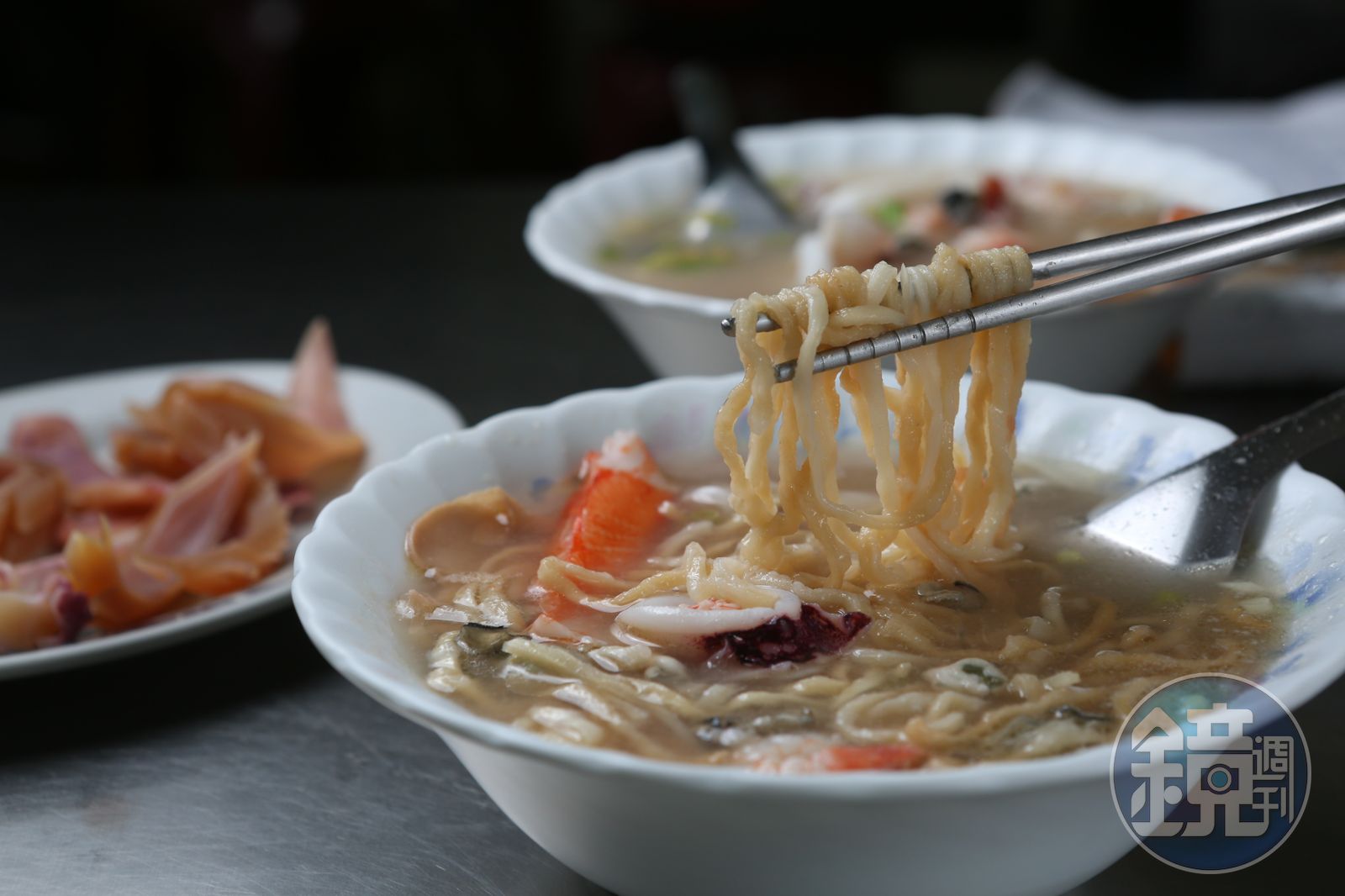 秃頭老爹鮑魚海產粥絕對是台南深夜食堂,每天從晚上9點半開到清晨5點,招牌的鮑魚海產粥在柴魚湯底加入火燒蝦,安平蚵、透抽,蟹肉,起鍋時放會放一片蟹肉棒和鮑魚(其實是深海魷魚),看來豐盛,香氣迷人。不想吃粥可以換成意麵,炸過的麵條飽吸湯汁,相當美味。
