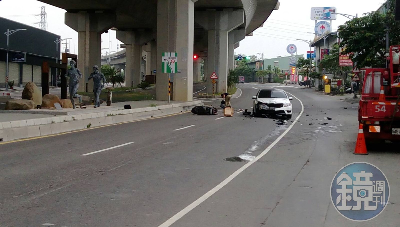 遭賓士車撞飛2、3公尺高,倒地慘死的黃姓老婦人(65歲),老公當時也騎著機車跟在後面,只差5分鐘的距離,就可能遭遇不測,幾分鐘前才從仁雄路住家出來,怎麼也沒想到轉個彎,老伴就成了冰冷的遺體,阿公想到就老淚縱橫。