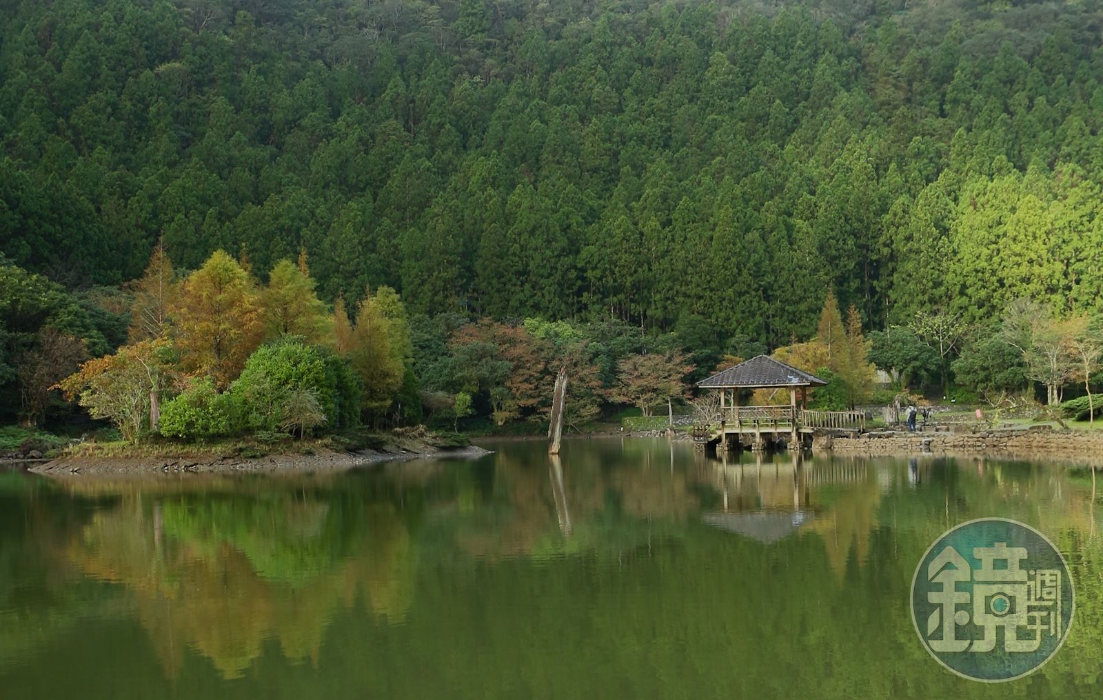 儘管11月下旬,都市裡的晴陽讓人感受不到絲毫秋的味道,但位在宜蘭中海拔山區裡的明池森林遊樂區,日夜溫差大,湖中小島種植的落羽松已開始逐漸轉紅,湖水倒映換上秋妝的青山,是許多遊客等待的最美秋景。