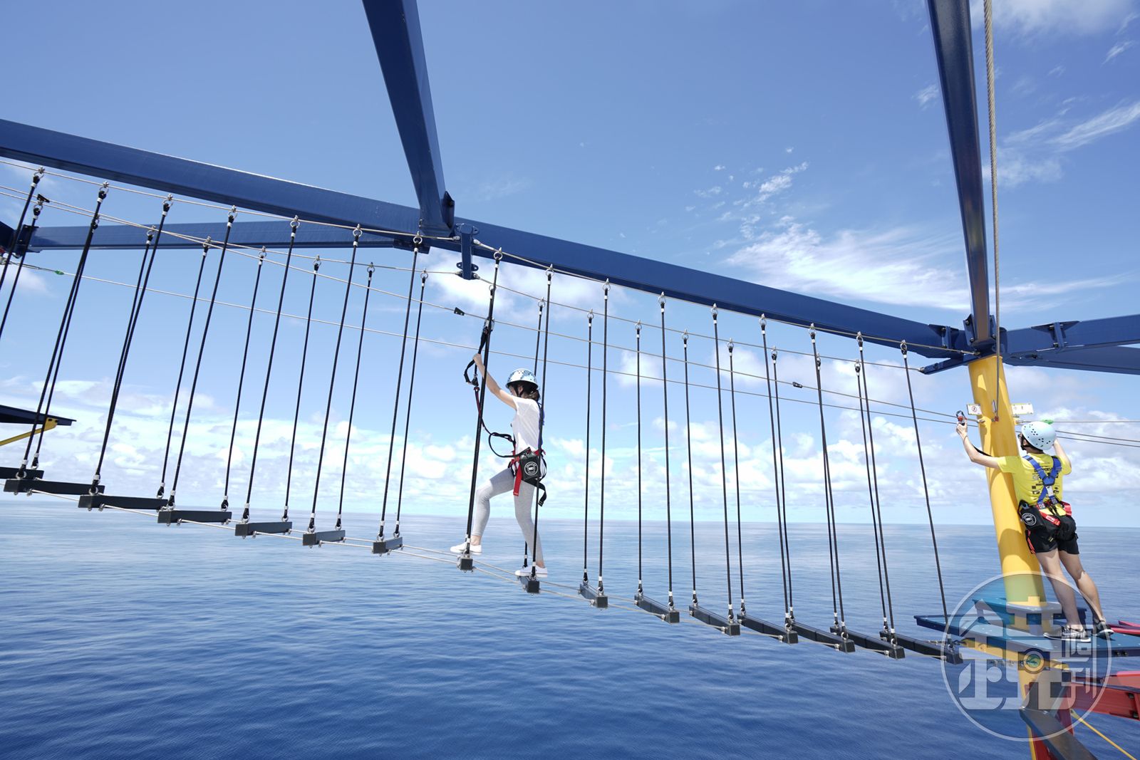 郵輪上最讓眼鏡哥印象深刻的,是高掛在18樓甲板上的繩索場,旅程的第2天,剛好碧海藍天,是個適合玩繩索場的好天氣,我二話不說穿好裝備後就第一個爬上繩索台,沒想到要溜高空滑索,還得先挑戰蜘蛛人般的平衡感。