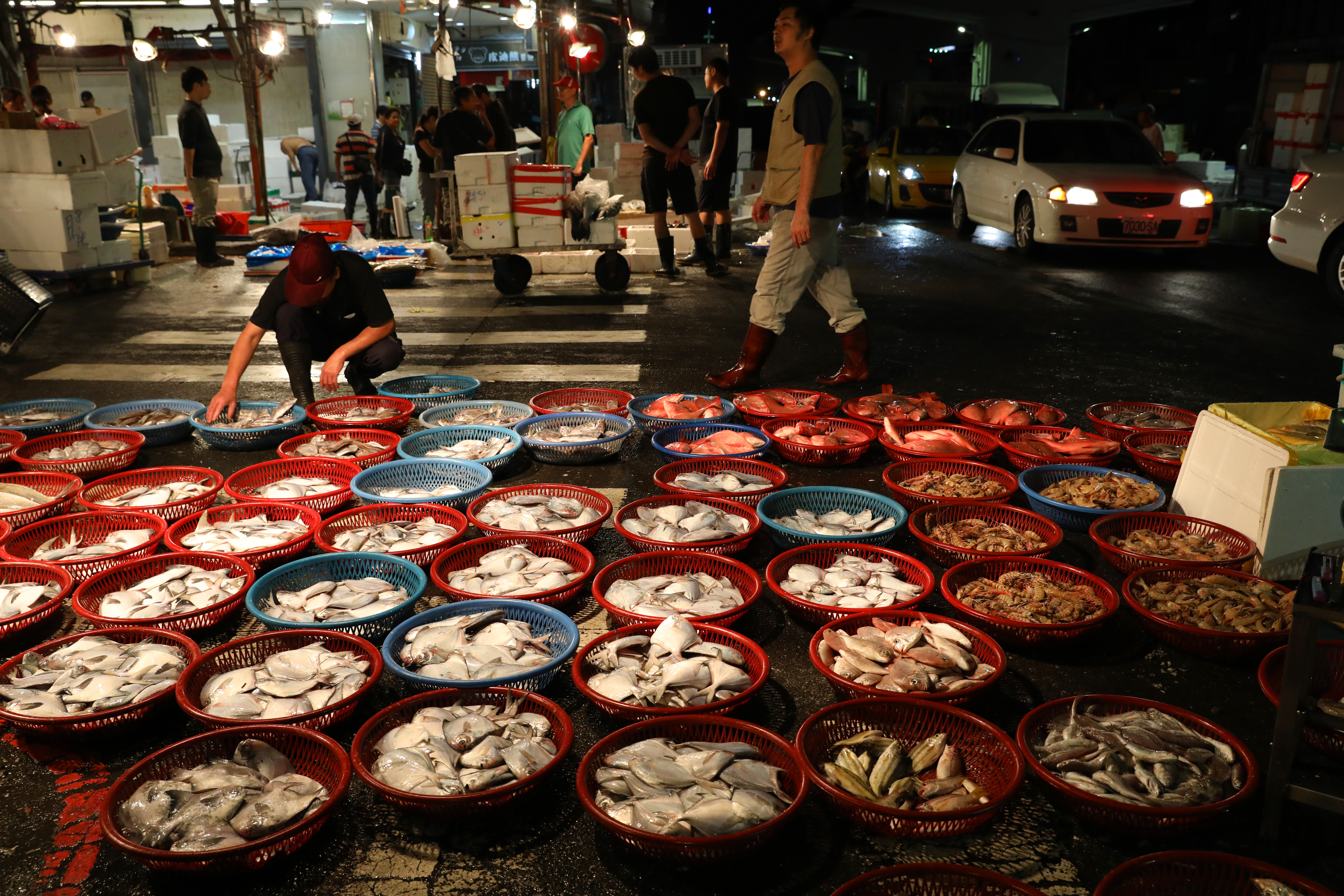 魚販忙著切開魚鰓,處理內臟。餐廳老闆正專心看魚貨的鮮度,還有三三兩兩來湊熱鬧的遊客,拿著相機捕獵畫面。 這不是特定日子,對崁仔頂的魚販而言,這是他們的日常,是魚市的生命力。