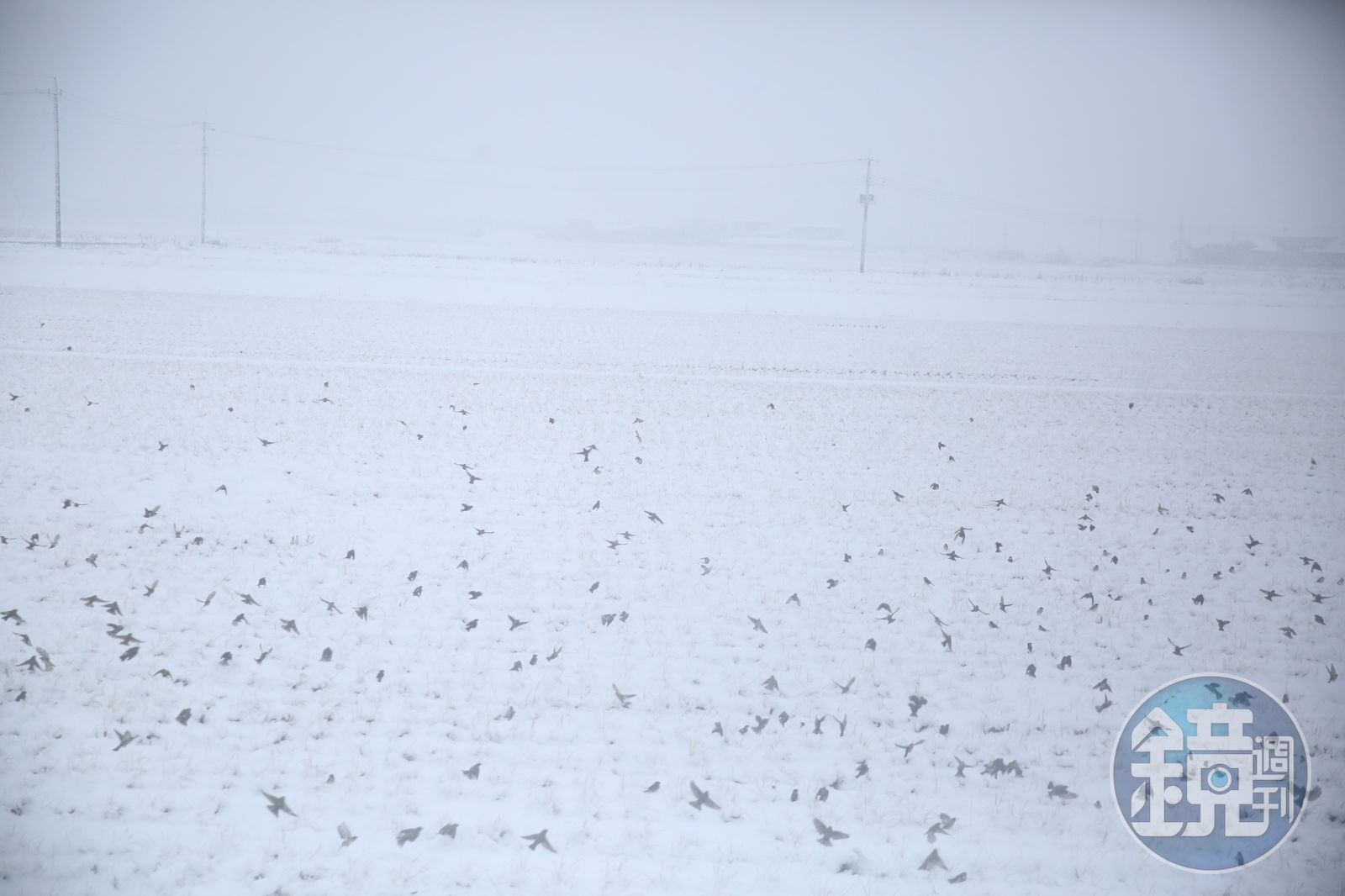 人生有時就是時機不對,該拍的卻很衰小沒拍到。不由得令人想起台灣的年輕新銳詩人陳柏伶的一首短詩〈雖小〉: 麻雀雖小 也沒我小 因為我 超雖小 全詩利用諧音大玩文字遊戲,令人莞爾,因為人生真的有時會遇到,比麻雀還雖小的事情。 過半小時,猛然看見一群麻雀在雪白的農田中飛起,不自覺的按下快門,失焦的鏡頭晃動也沒什麼構圖,不是什麼太好的照片,但這樣的照片,剛好解釋人生的雖小。
