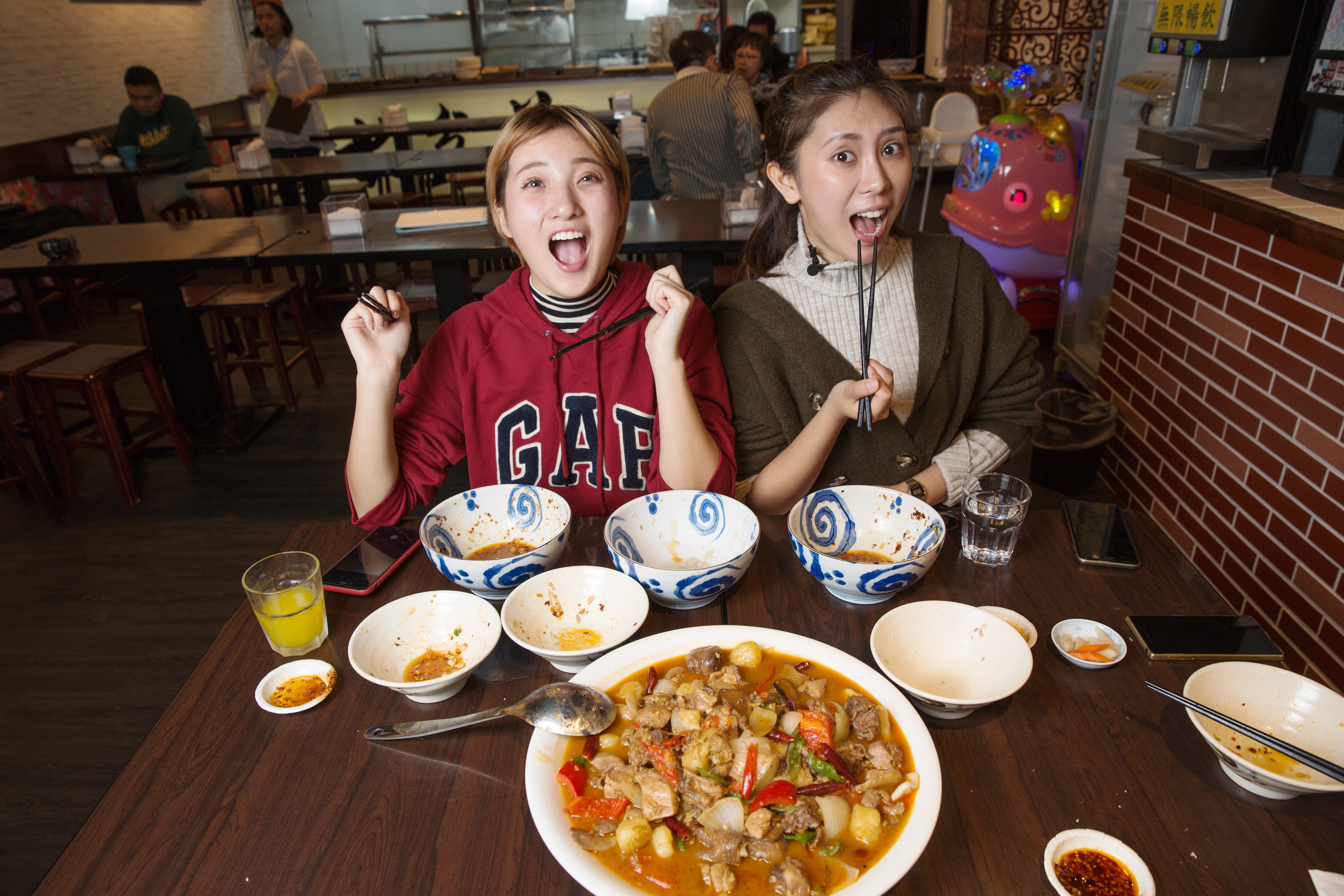 老闆新推出的「大盤雞」,也讓兩人頓時瘋狂起來,新疆大盤雞是道名菜,但映含直說:「我在新疆吃過最好吃的大盤雞,就是咱們陝西回民開的。」大盤雞中也有褲帶麵,這頓飯可讓2個女孩吃得撐了。