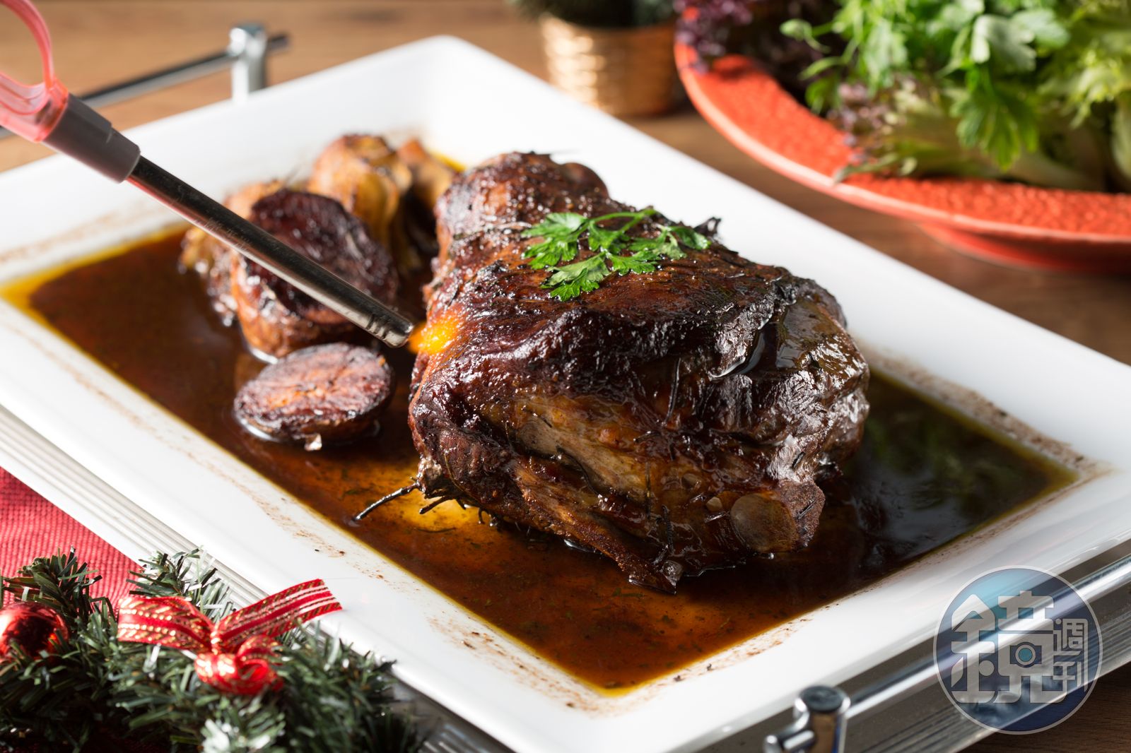 Claudio親自為我們示範這道耶誕料理「烤羊腿及香料馬鈴薯」,只見他把2.5公斤重的生羊腿,劃斜刀塞進新鮮迷迭香,抺上義式香料、鹽、胡椒後,以熱鍋煎到表面焦化鎖住肉汁,接著把羊腿移進烤盤,加馬鈴薯、茴香頭、歐芹、蒜頭等,倒入風味濃郁醇厚的chianti紅酒,一起烤2到3個小時。熱騰噴香的烤羊腿上桌時,還要澆上茴香酒、點火,此時在羊腿上燃燒的魔幻般火焰,頓時炒熱節慶氣氛,尤其是點火瞬間飄散的馥郁酒香,聲色勾人。