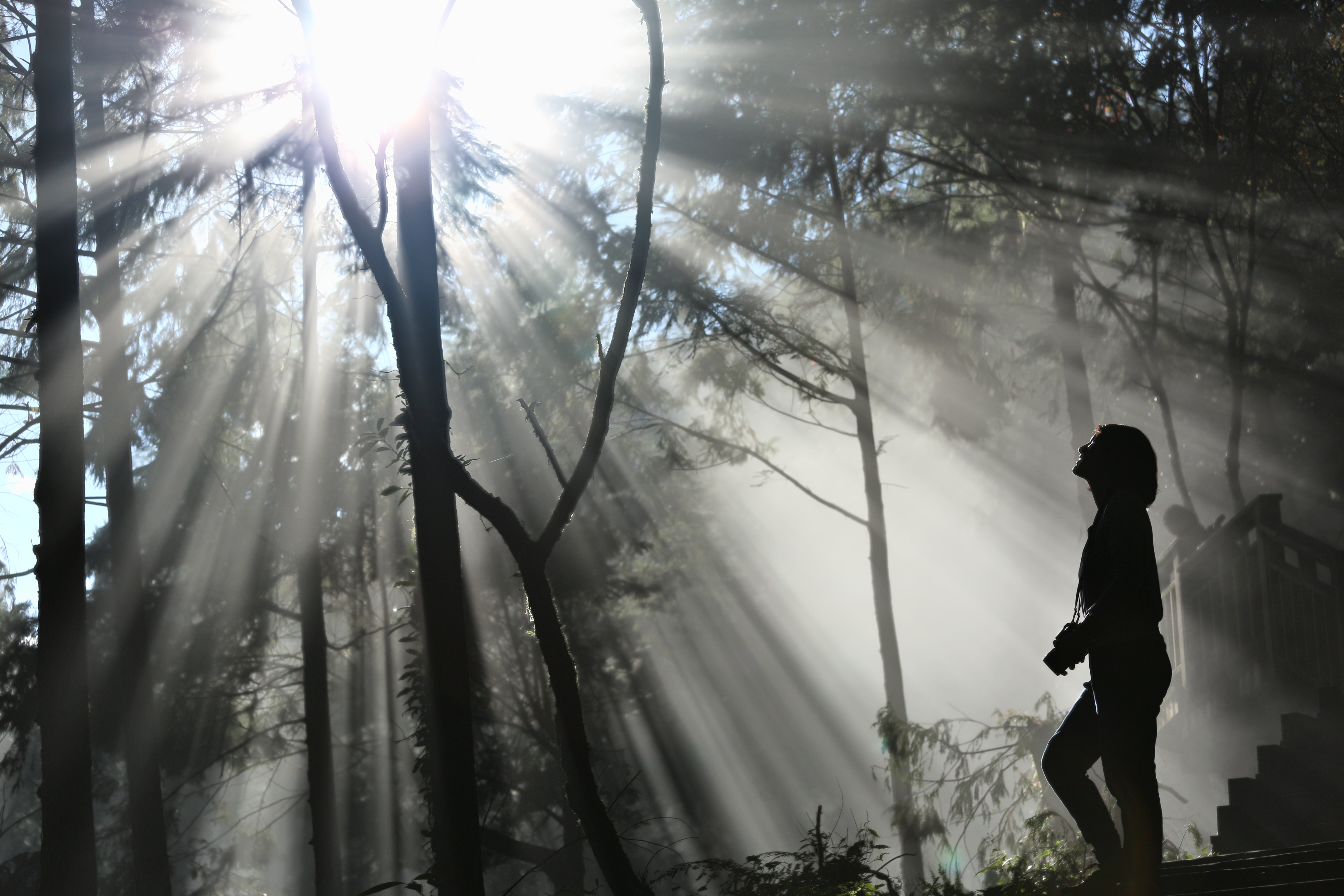 宜蘭的明池森林遊樂區,冬夜下了一個晚上的雨,第二天早上陽光出來了一個多小時,也算是老天給面子,但下午的神木園行程,導覽老師告訴我,要好天氣幾乎不可能,多半是雨霧霏霏。 在接駁車上霧氣更加重了,能見度大約不到5米,同行團員說:「都是霧,看不到神木能退錢嗎?」導覽老師只能沒好氣回道:「看到神木加霧,要多收50元。」司機轉過頭來說:「這裏每天都下雨啦,一年有200多天是雨天。」「看來這錢不能不交了,」我說。 到園區後,太陽穿雲破霧而出,林間濃霧在陽光照射下,如霞光千道呈現放射狀,空氣中的微小粒子耀然而出, 按下快門,宛如進入魔法世界的迷霧森林。