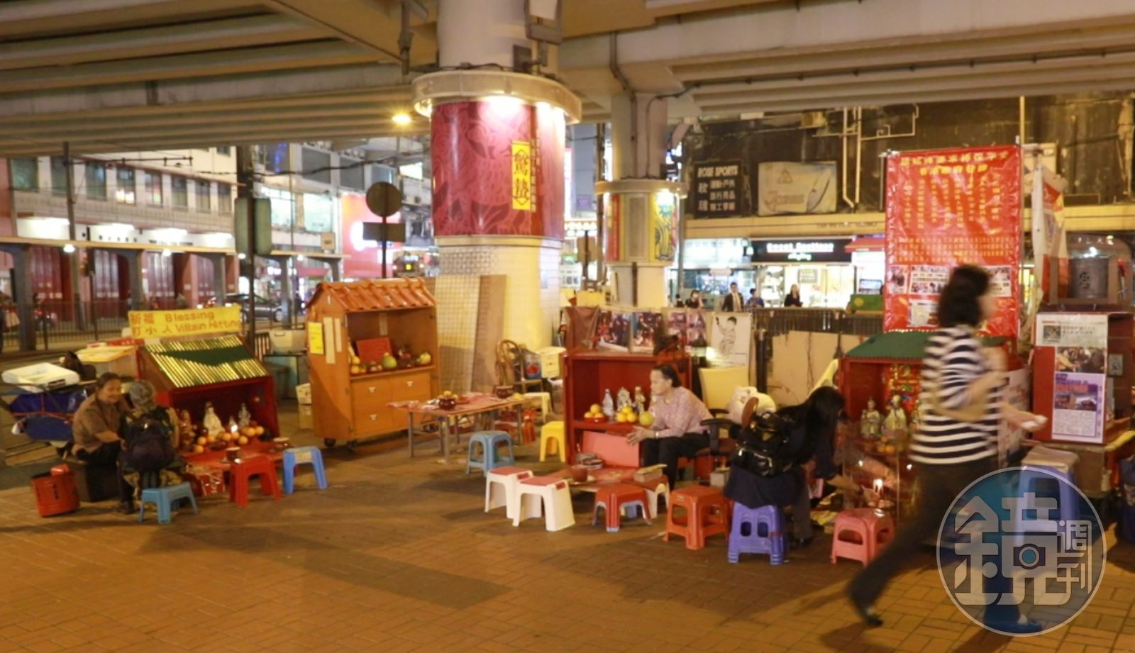 抵達鵝頸橋當天的時間,大約是晚上9點半,橋下堆滿阿婆們打小人的旗子(招牌)跟生財工具,還祭祀著兩、三位神明,有虎爺,有土地公,也有菩薩,依照你的喜好任君挑選。昏黃的路燈光暈,則為這裡加持了一點神祕的氣氛,對照10公尺外燈光眩目的名牌大街,像是一個銅鑼灣、兩個世界,帶著些許衝突感。