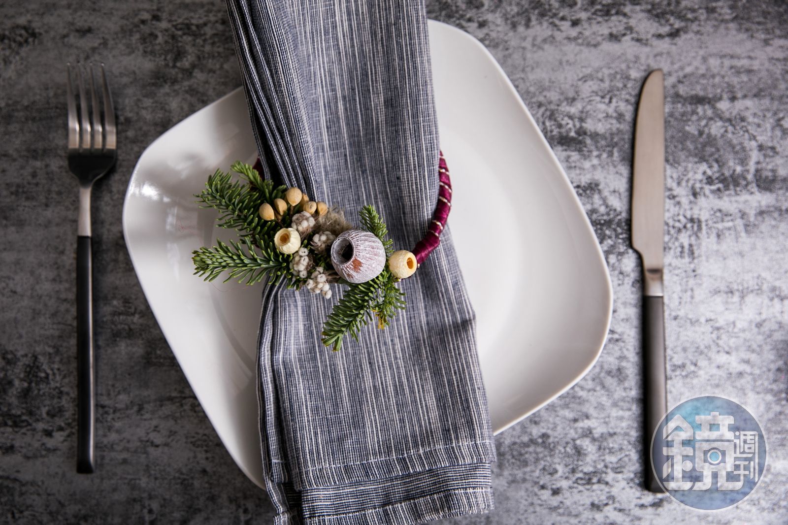 前陣子製作耶誕花圈時靈光一閃,用剩下的材料順手也做了一個餐巾環,雖然台灣並不流行使用餐巾環,但是一旦放上餐桌,可是頓時增色不少。